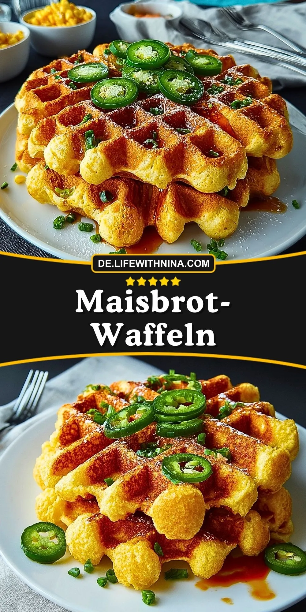 Herzhafte Maisbrot-Waffeln: außen knusprig, innen saftig und voller Maisaroma. Perfekt als pikantes Frühstück, Snack oder Beilage zu Chili, Salat oder Grillgerichten. Die feine Schärfe von Jalapeños macht sie zum besonderen Genuss – schnell gemacht, variabel und immer ein Hit!