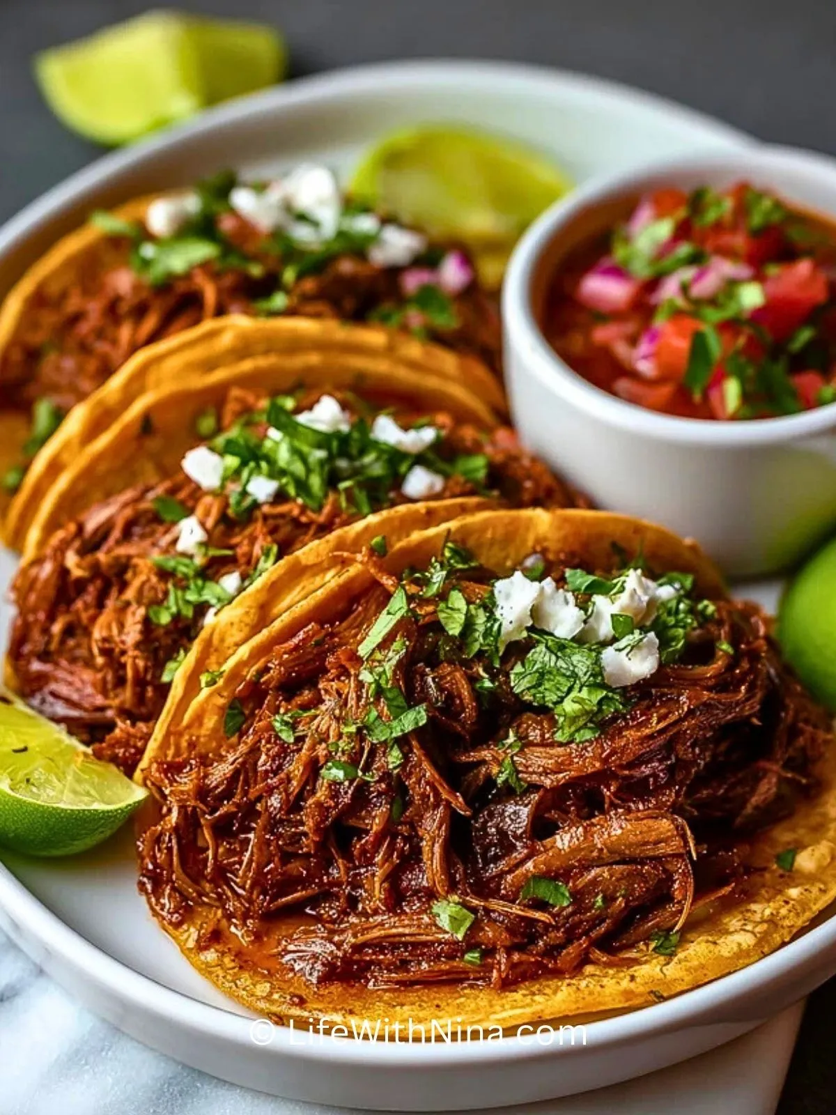 Durch die lange, schonende Garzeit im Slow Cooker kann das Rindfleisch alle Aromen der Gewürze, Tomaten, Zwiebeln und des Limettensafts vollständig aufnehmen. Das Fleisch wird unglaublich zart und lässt sich mühelos mit zwei Gabeln auseinanderziehen. Gleichzeitig verdichtet sich die Sauce zu einem intensiven, leicht rauchigen und angenehm scharfen Geschmack, der perfekt mit frischen Toppings wie Salsa und Koriander harmoniert.
