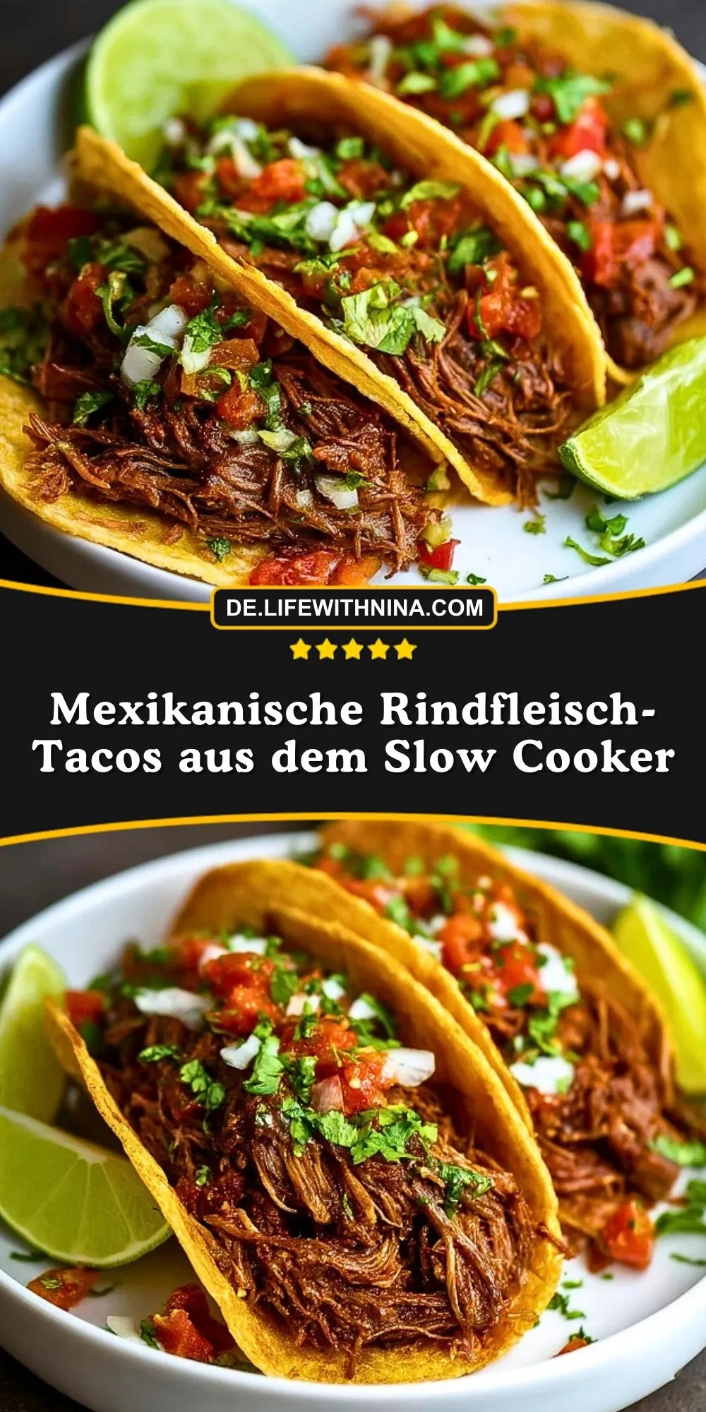 Saftiges, butterzartes Rindfleisch, das stundenlang im Slow Cooker in einer würzigen Tomaten-Limetten-Sauce schmort, landet am Ende in warmen Mais-Tortillas und wird mit frischer Salsa, Koriander und einem Klecks Schmand gekrönt – genau das sind diese mexikanischen Rindfleisch-Tacos. Sie gelingen mit wenig Aufwand, schmecken aber, als hättest du den ganzen Tag in der Küche gestanden.