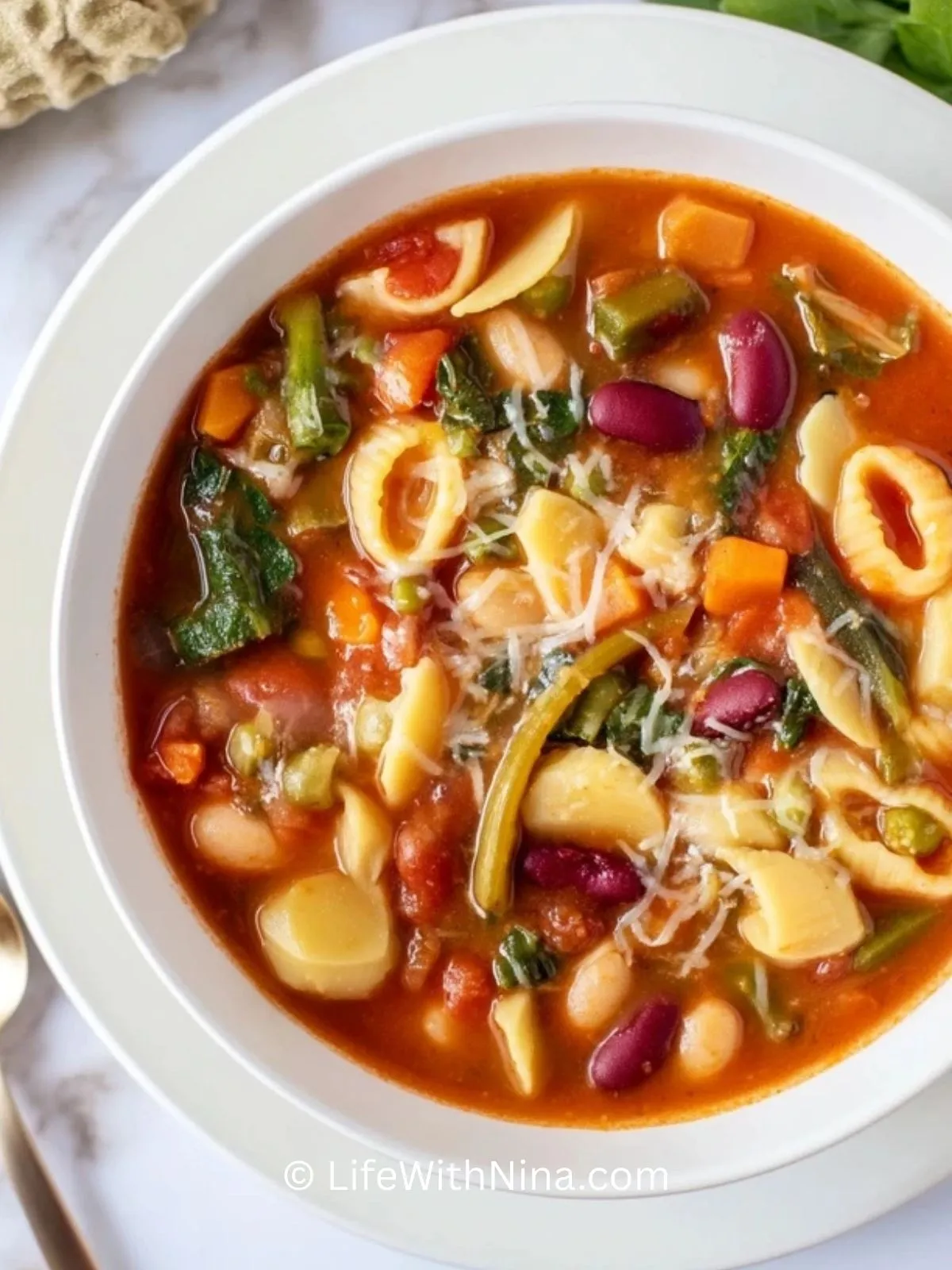 Diese klassische Minestrone Suppe vereint frisches Gemüse, Bohnen und Nudeln in einer aromatischen Tomatenbrühe. Perfekt als sättigende Hauptmahlzeit oder zum Vorkochen für mehrere Tage.