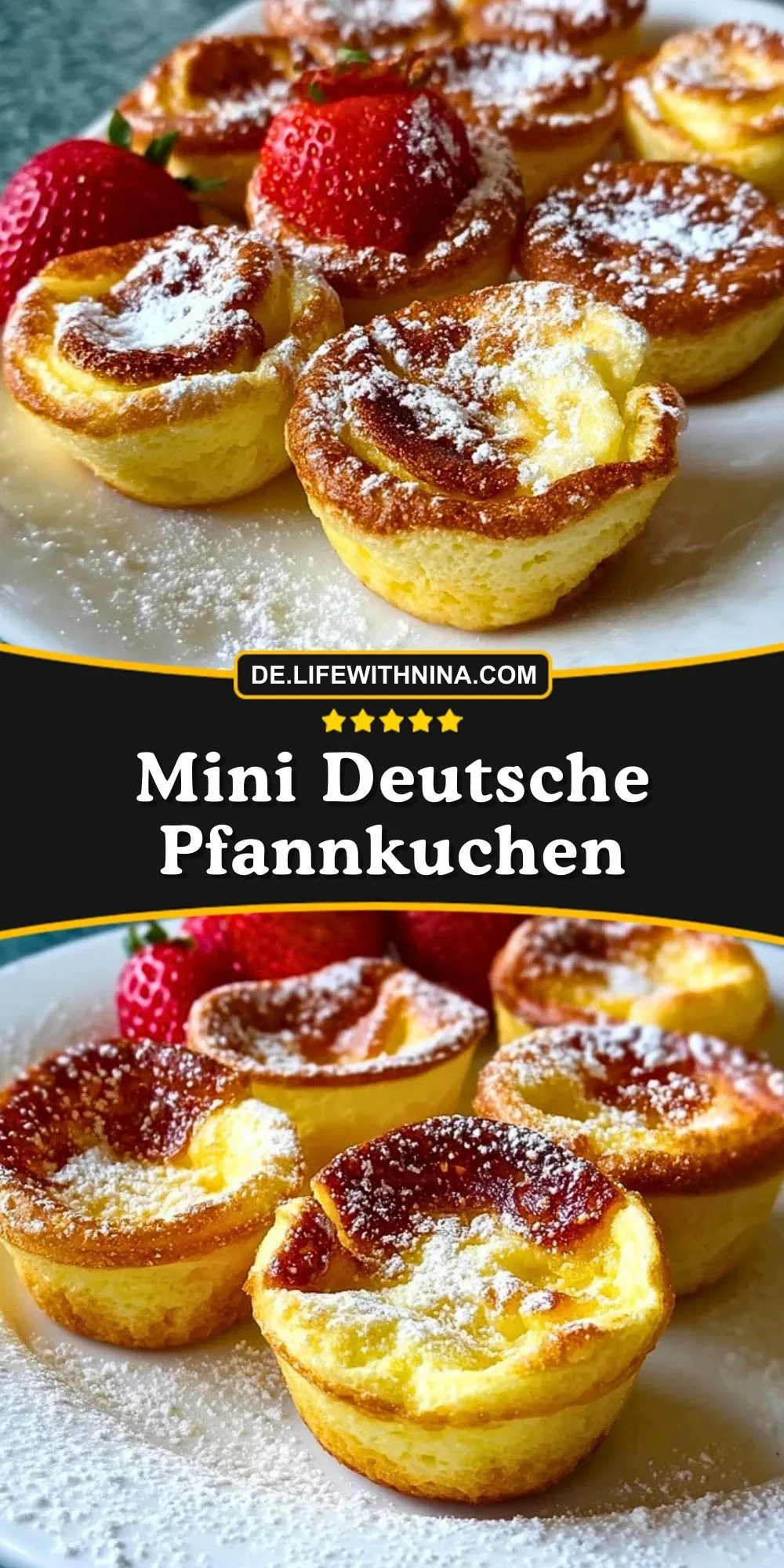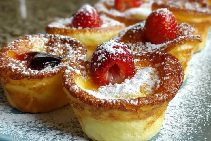Fluffige Mini Deutsche Pfannkuchen, im Muffinblech gebacken, mit frischen Erdbeeren, Puderzucker oder Marmelade serviert. Perfekt zum Frühstück, Brunch oder als raffiniertes Dessert!