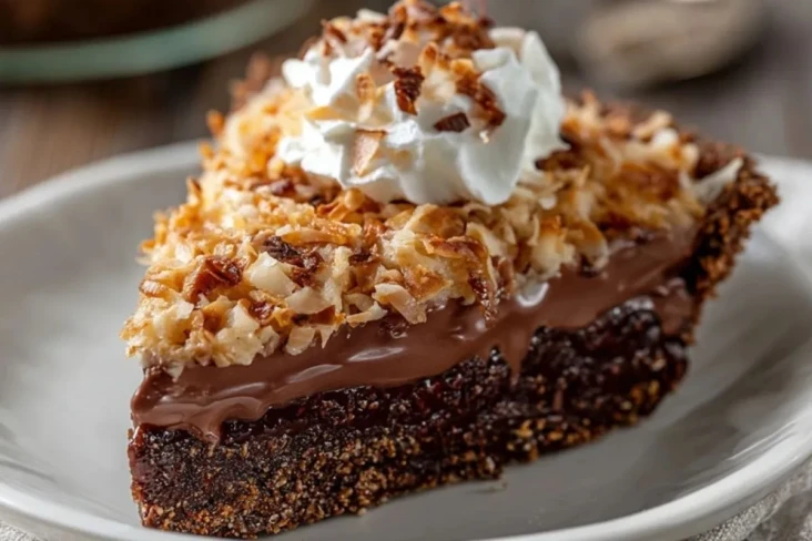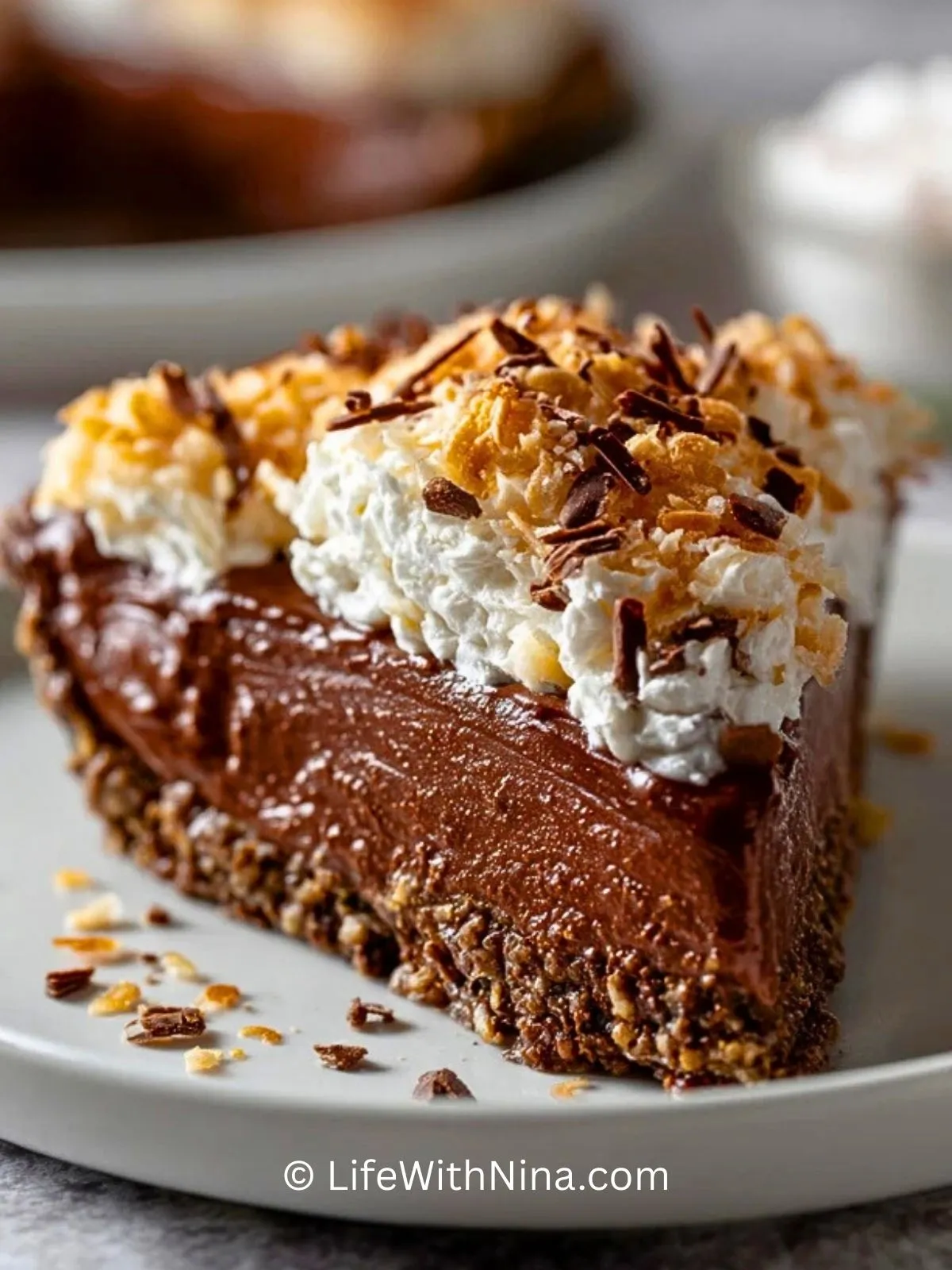 Nimm die Torte etwa 10 Minuten vor dem Servieren aus dem Kühlschrank. Garniere sie nach Wunsch mit einem Klecks Schlagsahne, zusätzlichen Kokosraspeln oder ein paar gehackten Pekannüssen.