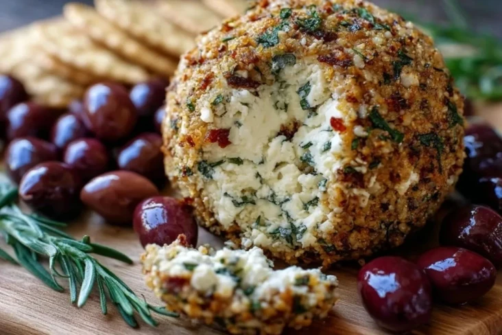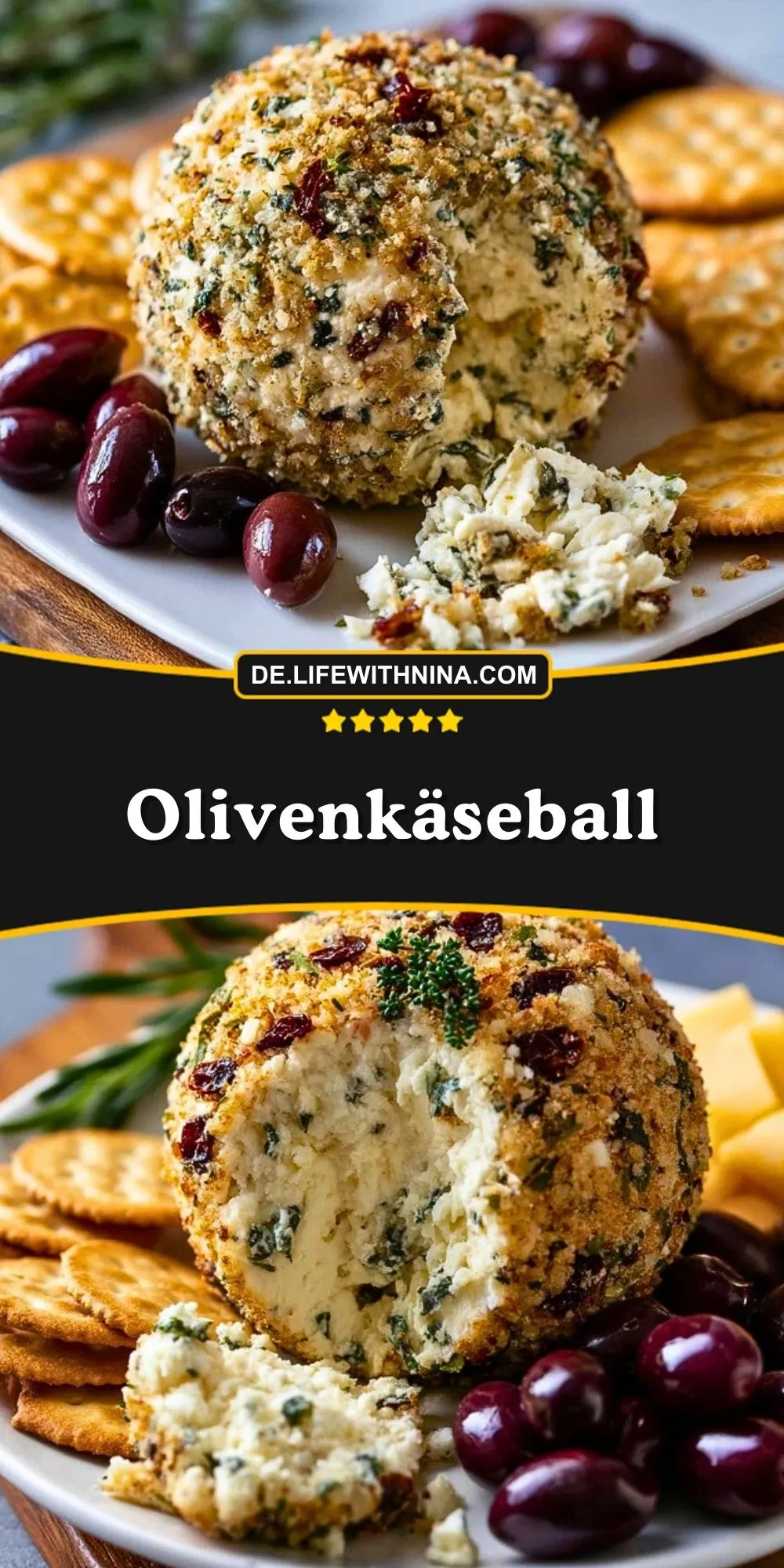 Dieser cremige Olivenkäseball mit frischen Kräutern, knackiger Nusskruste und würzigen Oliven ist die perfekte Vorspeise für gesellige Abende, Buffets und Feiertage.