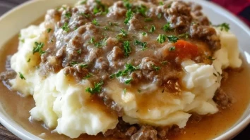 Hackfleisch mit Bratensoße auf Kartoffelpüree