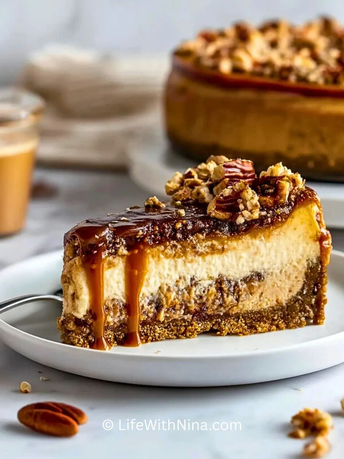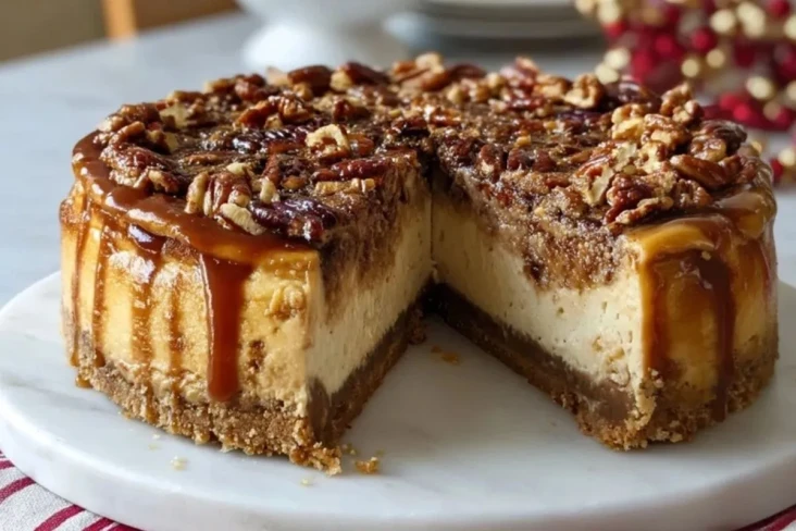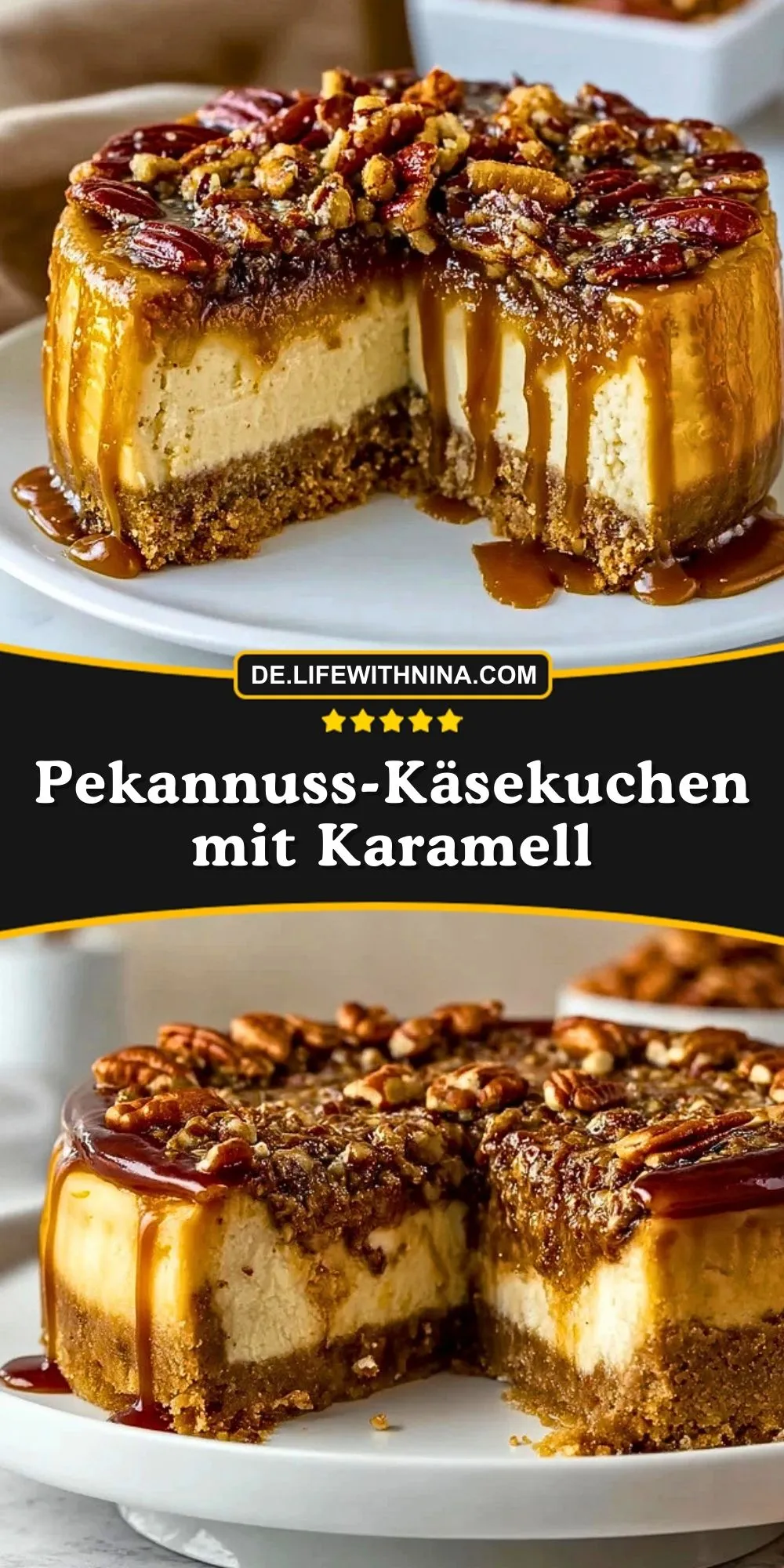 Cremiger Käsekuchen trifft auf knusprigen Keksboden, karamellisierte Pekannüsse und eine goldene Schicht Karamell. Der perfekte Kuchen für festliche Anlässe und Genießer, die es nussig und süß lieben!