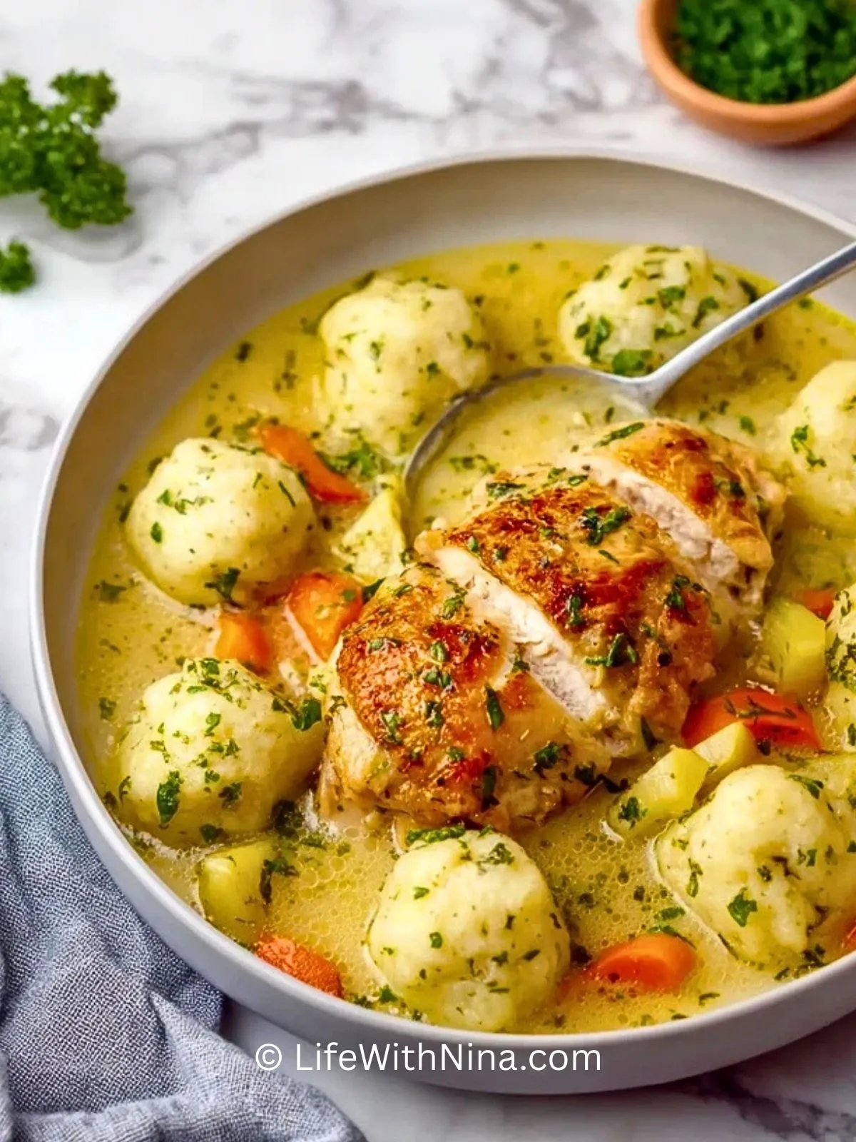 Saftiges Hähnchen, fluffige Kartoffelknödel und buntes Gemüse in einer würzigen Brühe – dieses Wohlfühlgericht schmeckt wie bei Oma und macht die ganze Familie satt und glücklich!