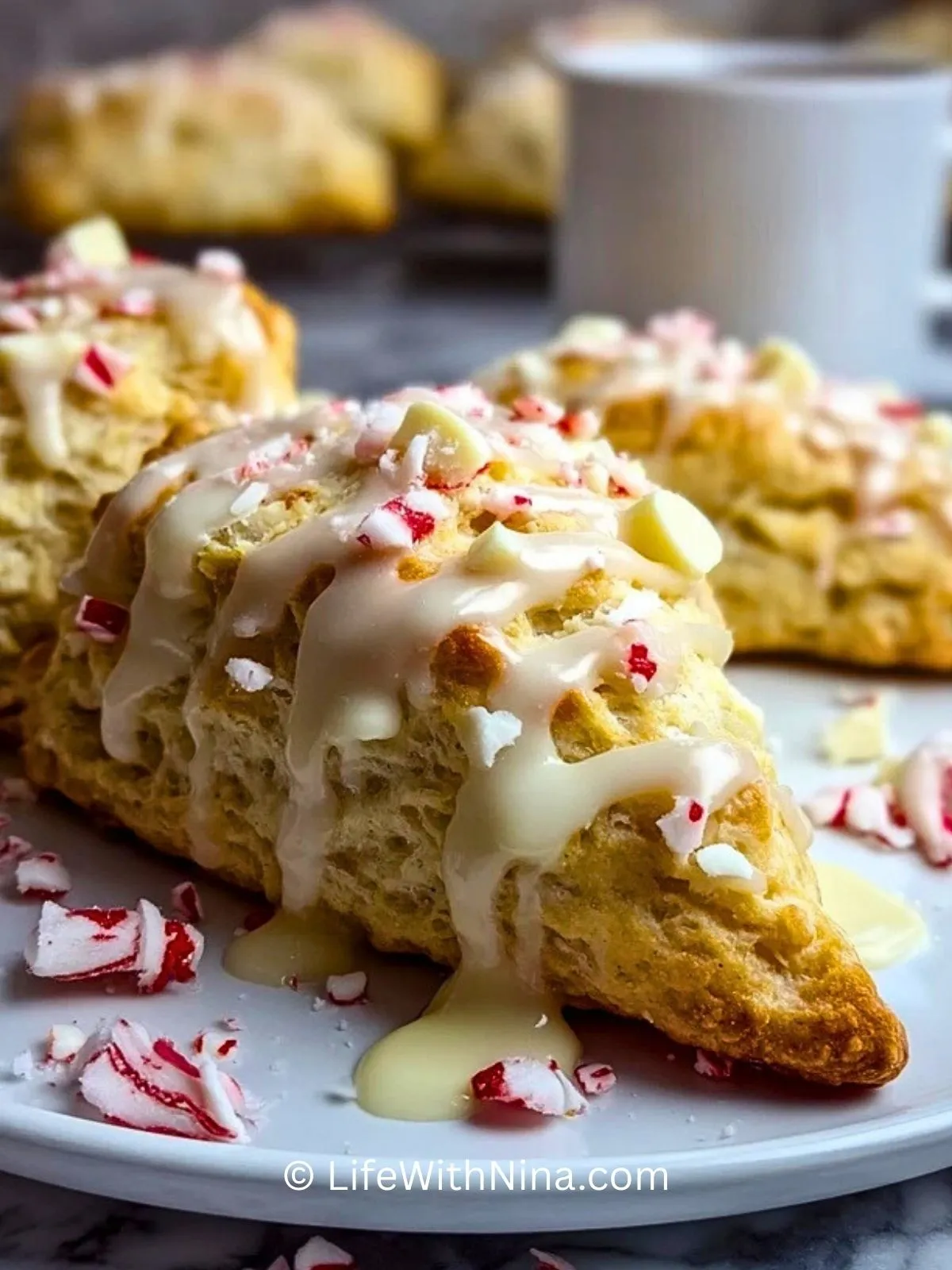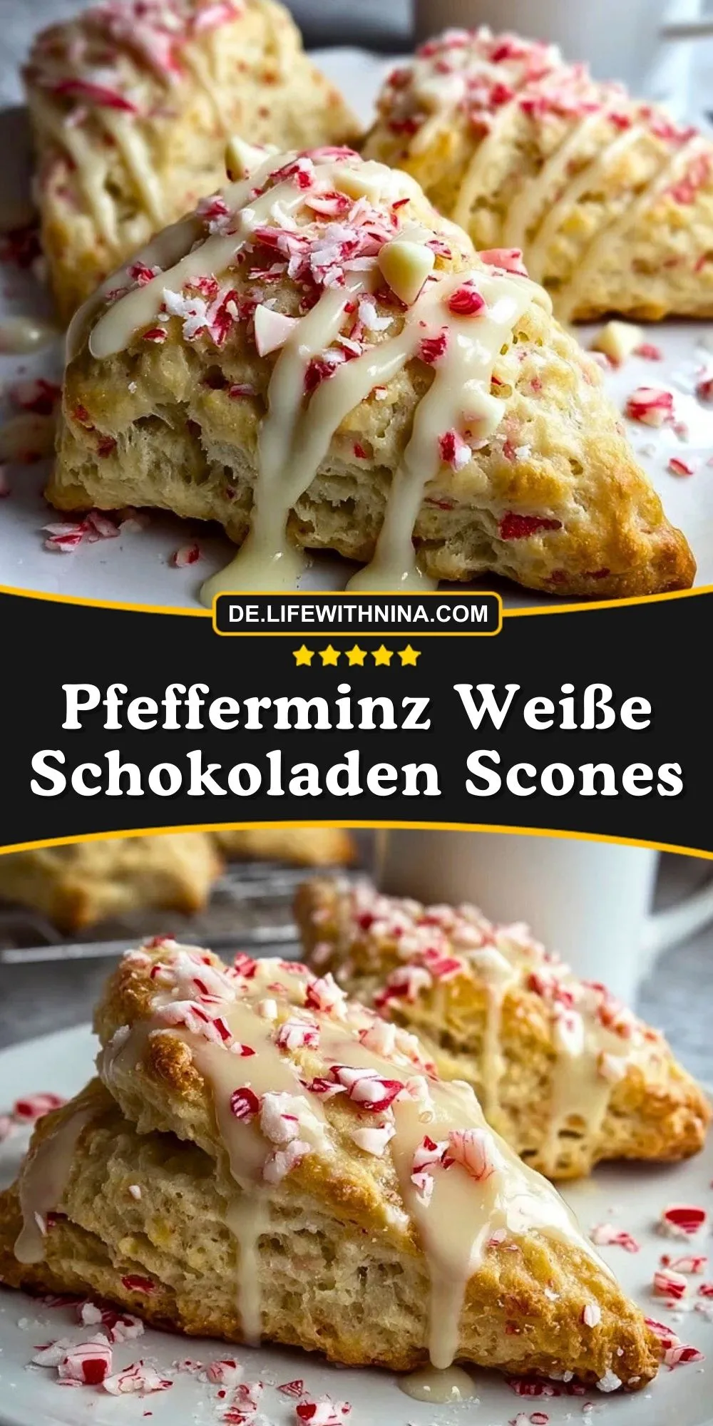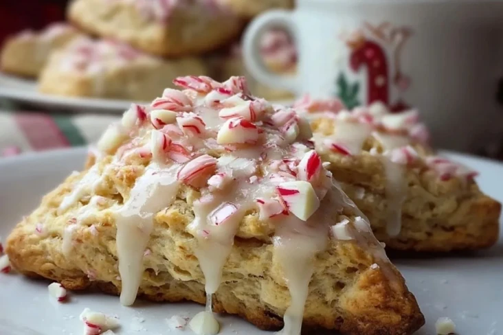 Puderzucker mit etwas Milch zu einer glatten Glasur verrühren, über die leicht abgekühlten Scones träufeln und mit zerstoßenen Pfefferminzbonbons bestreuen.