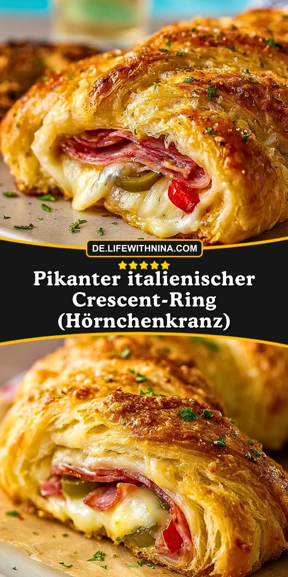 Ein pikanter italienischer Crescent-Ring ist der Star auf jedem Partybuffet! Die fluffigen, goldbraunen Hörnchen werden großzügig mit würzigem Schinken, geschmolzenem Käse, Paprika und aromatischen Oliven gefüllt. Ein Hauch italienischer Kräuter macht diesen Snack besonders verführerisch und sorgt dafür, dass garantiert kein Stück übrig bleibt.