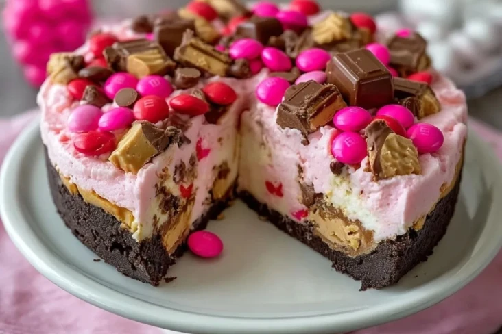 Pink M&M’s bringen Knusprigkeit, Farbe und eine zusätzliche schokoladige Note auf die Oberfläche und in die Füllung.