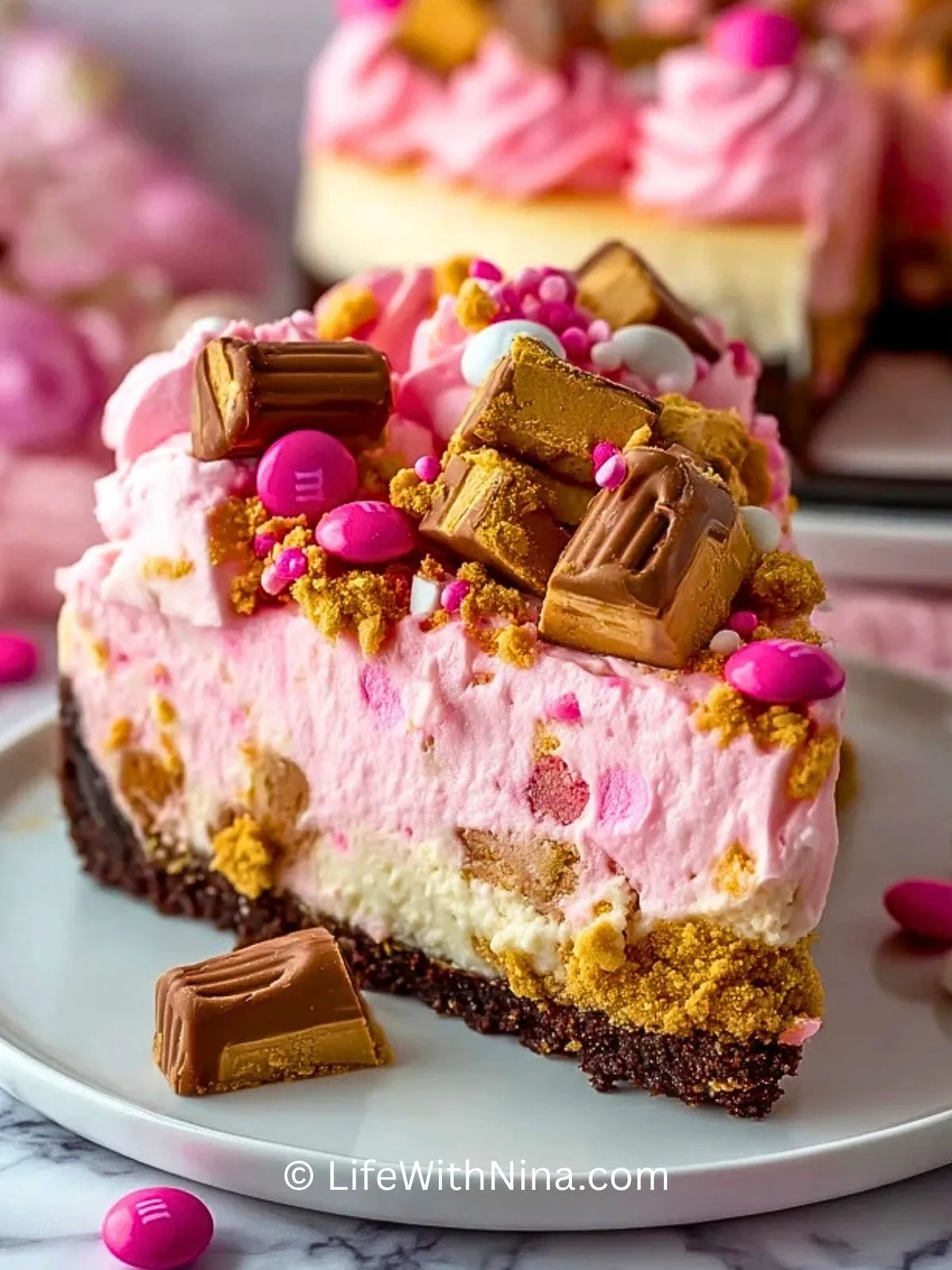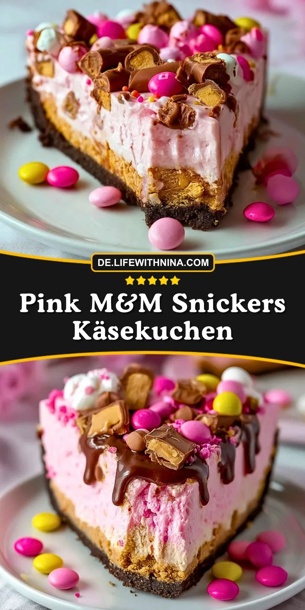 Keywords: Pink M&M Snickers Käsekuchen, Käsekuchen mit Snickers, rosa Cheesecake, Cheesecake mit M&M’s