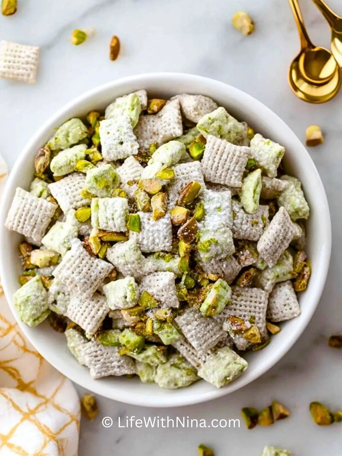 - Puderzucker: Umhüllt die Snacks und sorgt für das klassische „Muddy Buddy“-Finish.