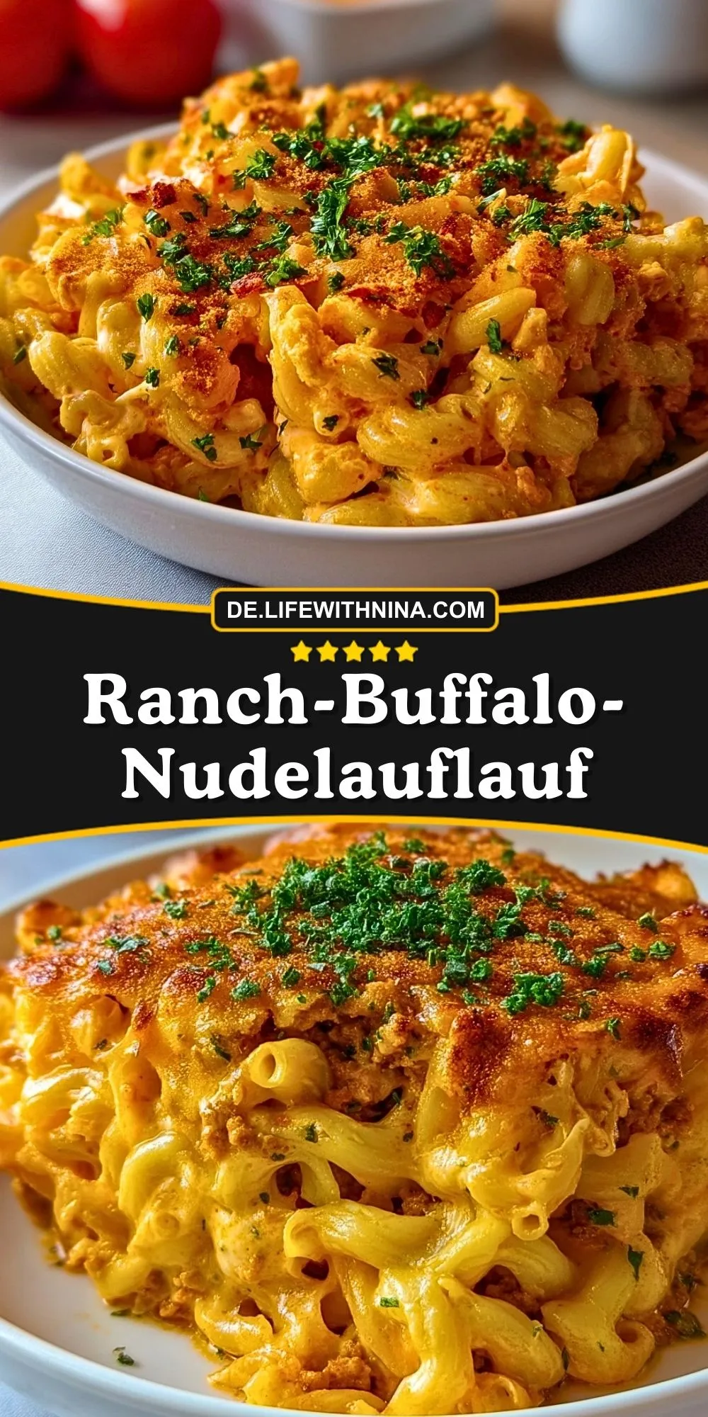 Herzhafter Ranch-Buffalo-Nudelauflauf vereint cremige Ranch-Soße, würzige Buffalo-Chicken-Noten, al dente Pasta und viel goldgelben Käse. Perfekt für alle, die würziges Soulfood mit etwas Schärfe lieben!