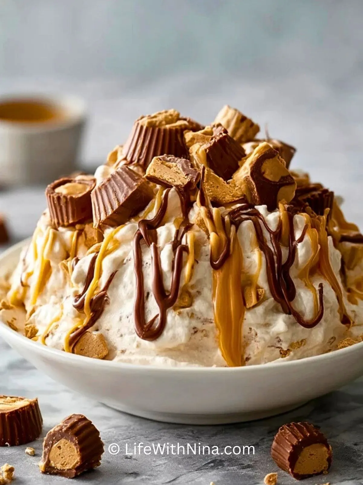 5. Masse in eine große Schale geben und mit restlichen Reeses-Stücken sowie Karamellsoße garnieren.
