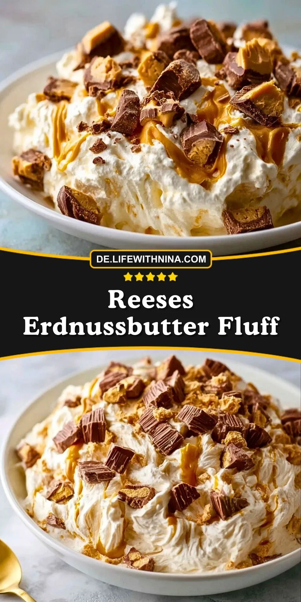 Ja, du kannst statt Reeses auch jede andere cremige Erdnussbutter verwenden. Der typische Geschmack von Reeses Cups macht dieses Rezept aber so besonders und sorgt für den echten amerikanischen Fluff-Genuss. Falls du keine Peanut Butter Cups hast, kannst du auch knackige Schokoladenstücke und Erdnussbutter als Alternative nehmen.