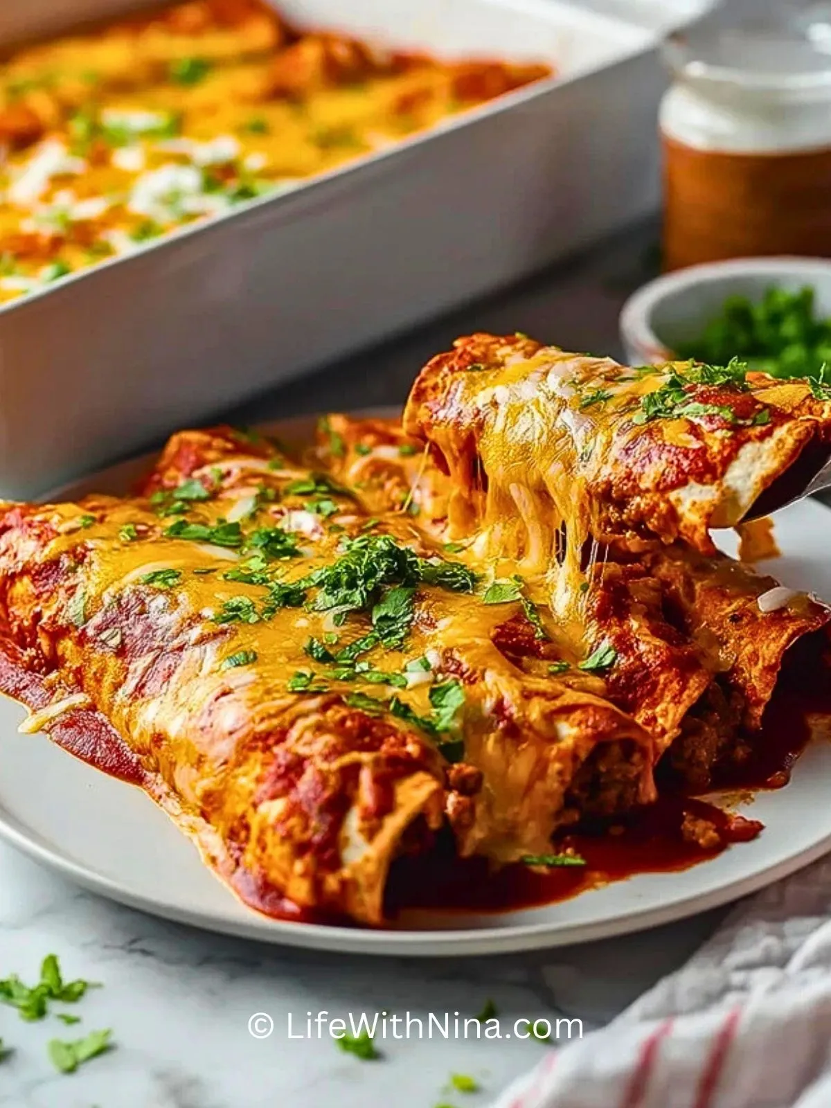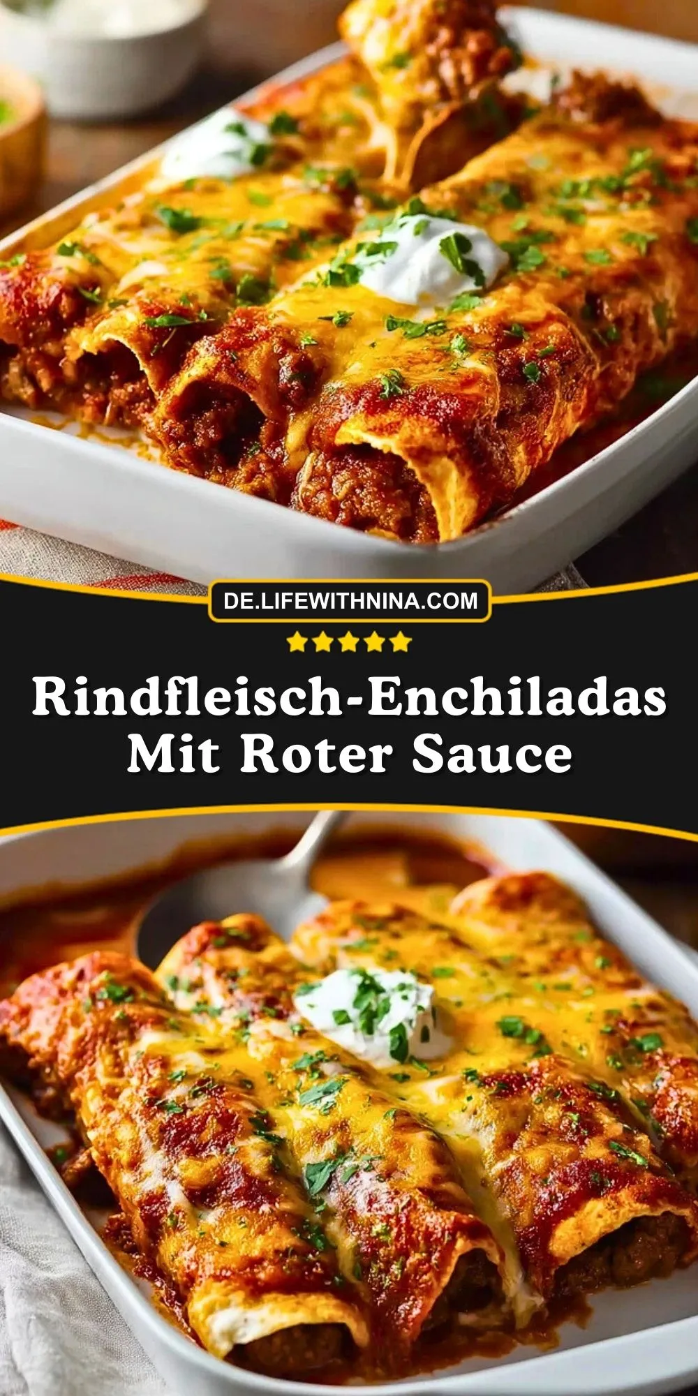 Rindfleisch-Enchiladas mit roter Sauce sind ein herzhaftes Ofengericht mit würziger Hackfleischfüllung, weichen Tortillas, aromatischer Tomatensauce und goldbraun überbackenem Käse. Sie sind ideal für ein sättigendes Familienessen, lassen sich gut vorbereiten und schmecken mit frischen Toppings wie Koriander, Frühlingszwiebeln und Sauerrahm besonders lecker.