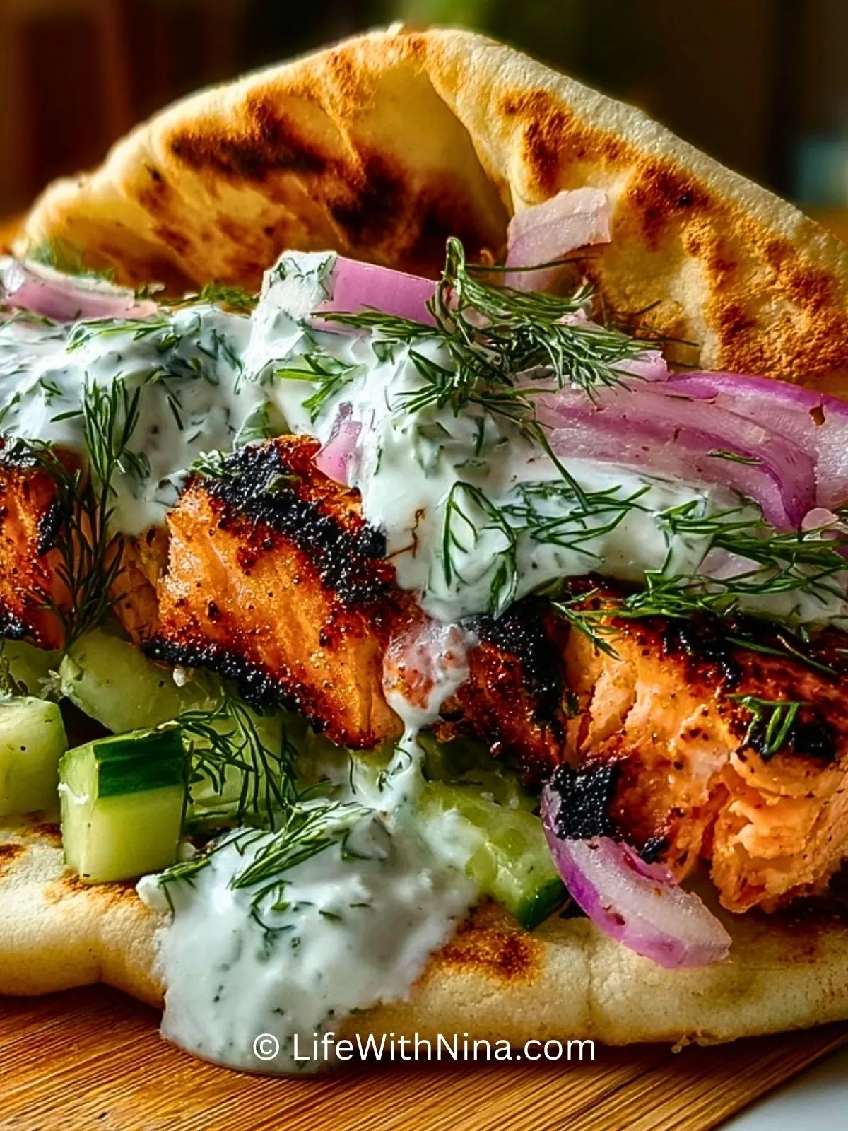 Saftige gegrillte Lachs-Gyros mit Dill-Joghurt-Soße