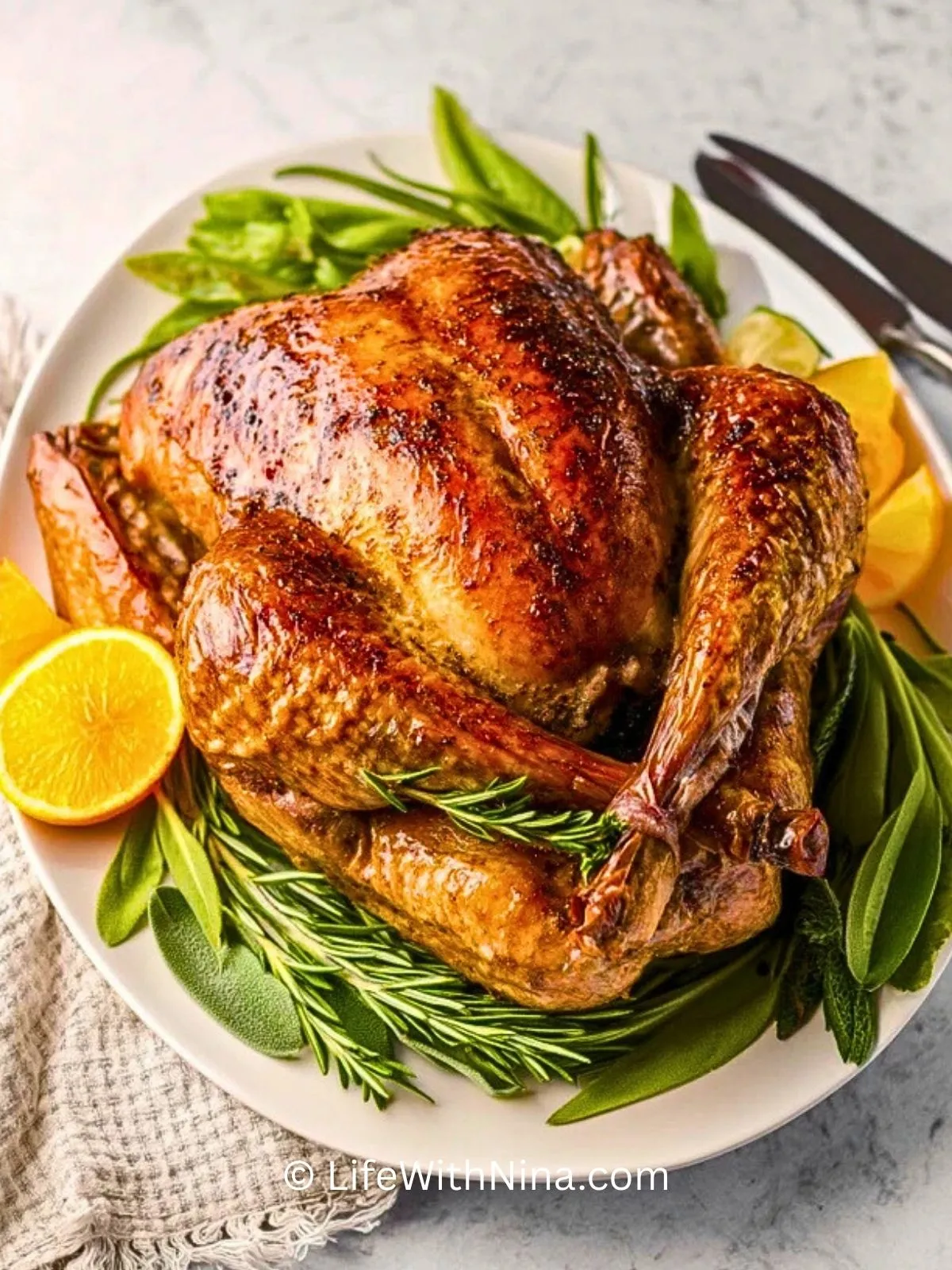 Richte den Saftigen Putenbraten auf einer großen Platte an, umgeben von dem gegarten Wurzelgemüse, frischen Kräutern, Orangenscheiben und Cranberrys. Schneide die Brust in dünne Scheiben und löse anschließend die Keulen vom Knochen. Serviere die Sauce separat in einer Sauciere, damit sich jeder am Tisch nach Belieben bedienen kann.