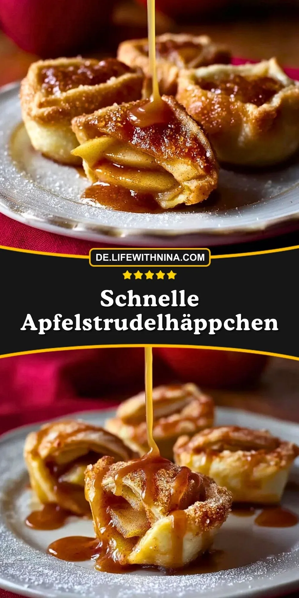 Ob als süße Überraschung für Gäste oder als gemütlicher Familien-Nachtisch: Diese Apfelstrudelhäppchen überzeugen durch ihre unkomplizierte Zubereitung und ihren unwiderstehlichen Geschmack. Saftige Apfelstückchen, verfeinert mit Zimt, Zucker und Rosinen, treffen auf knusprigen Teig – getoppt mit etwas Karamellsauce werden sie zu einem echten Highlight.