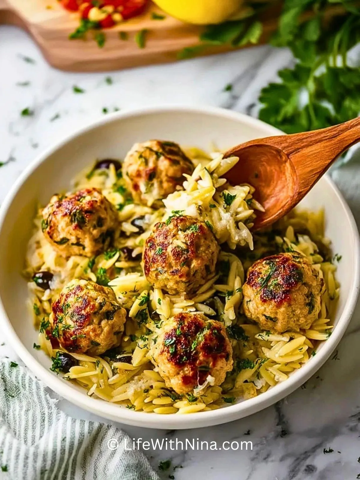 Saftige griechisch inspirierte Hähnchenfrikadellen treffen in diesem Rezept auf cremiges Zitronenorzo mit Spinat, Parmesan und frischen Kräutern. Das Gericht ist schnell gemacht, wunderbar aromatisch und perfekt für ein unkompliziertes Abendessen mit mediterranem Charakter.