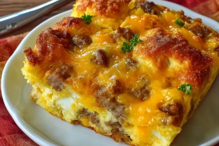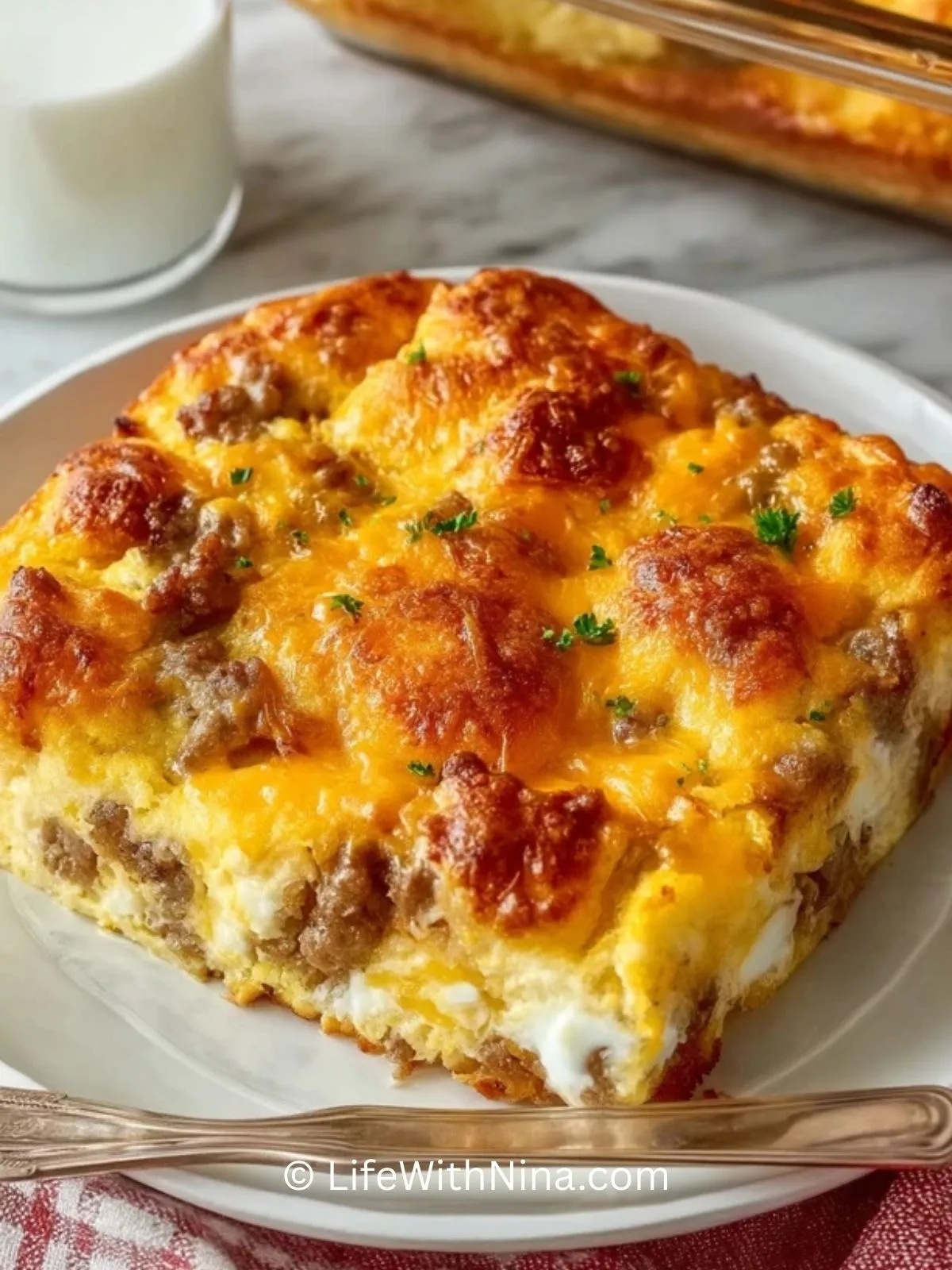 Herzhafter Frühstücksauflauf mit knusprigen Brötchen, würziger Bratwurst, fluffigen Eiern und geschmolzenem Käse. Perfekt für Brunch, Wochenenden oder wenn viele satt werden sollen – einfach vorzubereiten und super lecker!