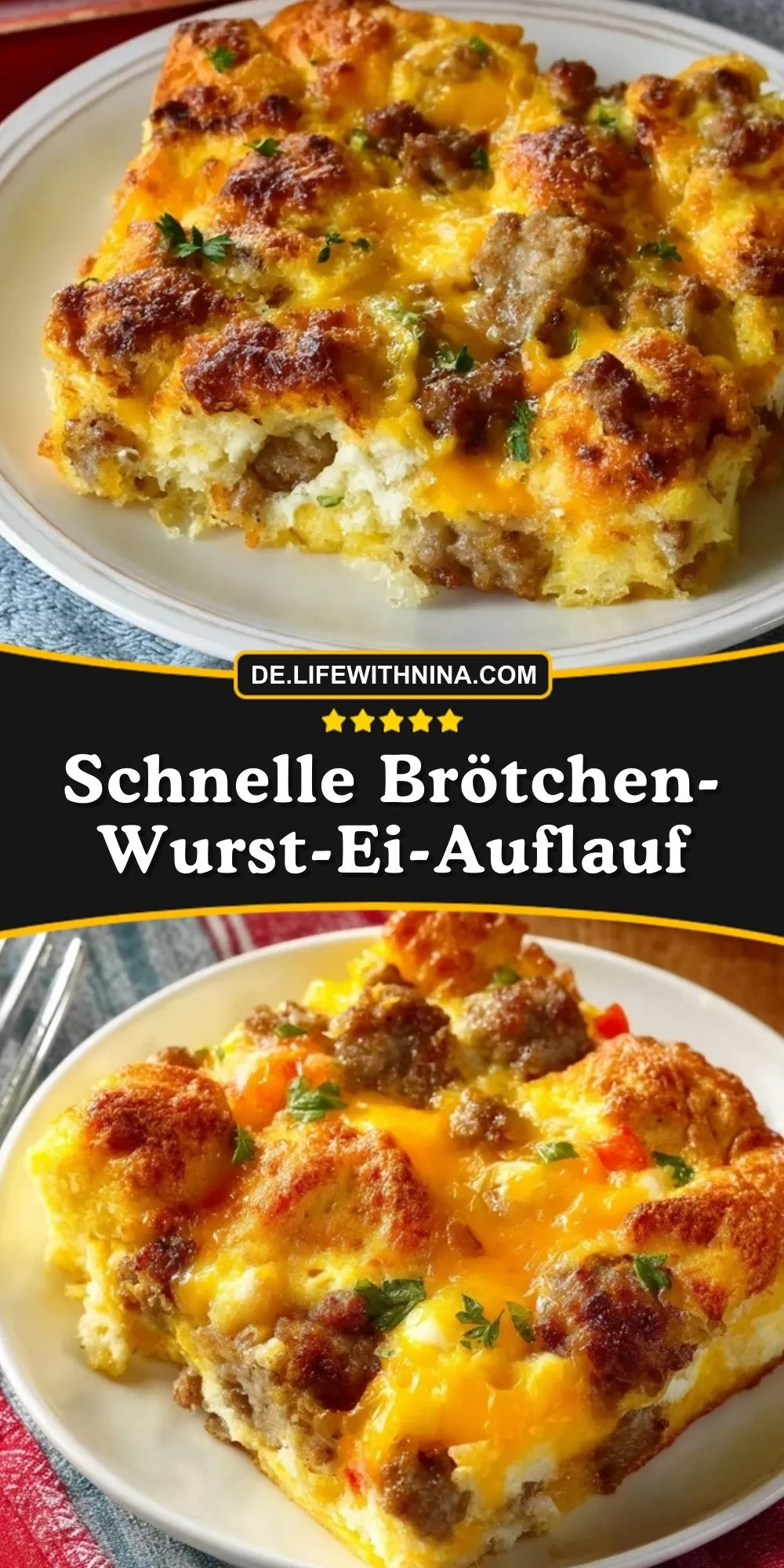 Ein Frühstücksauflauf, der sich perfekt für entspannte Wochenenden, Familienbrunch oder als herzhaftes Abendessen eignet: Der Schnelle Brötchen-Wurst-Ei-Auflauf ist herrlich würzig, sättigend und lässt sich wunderbar vorbereiten. Mit einer goldbraunen Kruste aus geschmolzenem Käse und einer herzhaften Füllung ist dieses Gericht ein absoluter Favorit am Frühstückstisch.