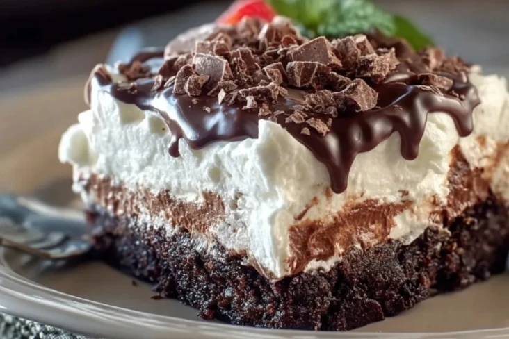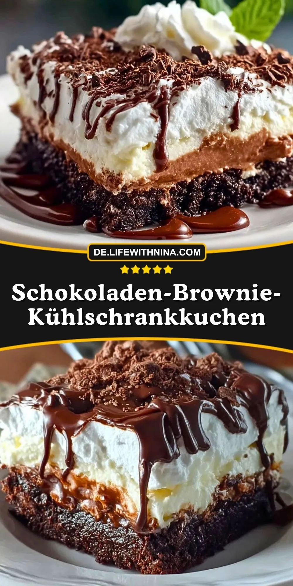 Ein unwiderstehlicher Schokoladen-Brownie-Kühlschrankkuchen: Saftiger Brownieboden, cremige Schoko-Frischkäse-Füllung, luftige Sahne und knackige Schokoglasur. Perfekt für Schokoladenfans und ohne großen Aufwand zubereitet – ein Highlight für jede Kaffeetafel.
