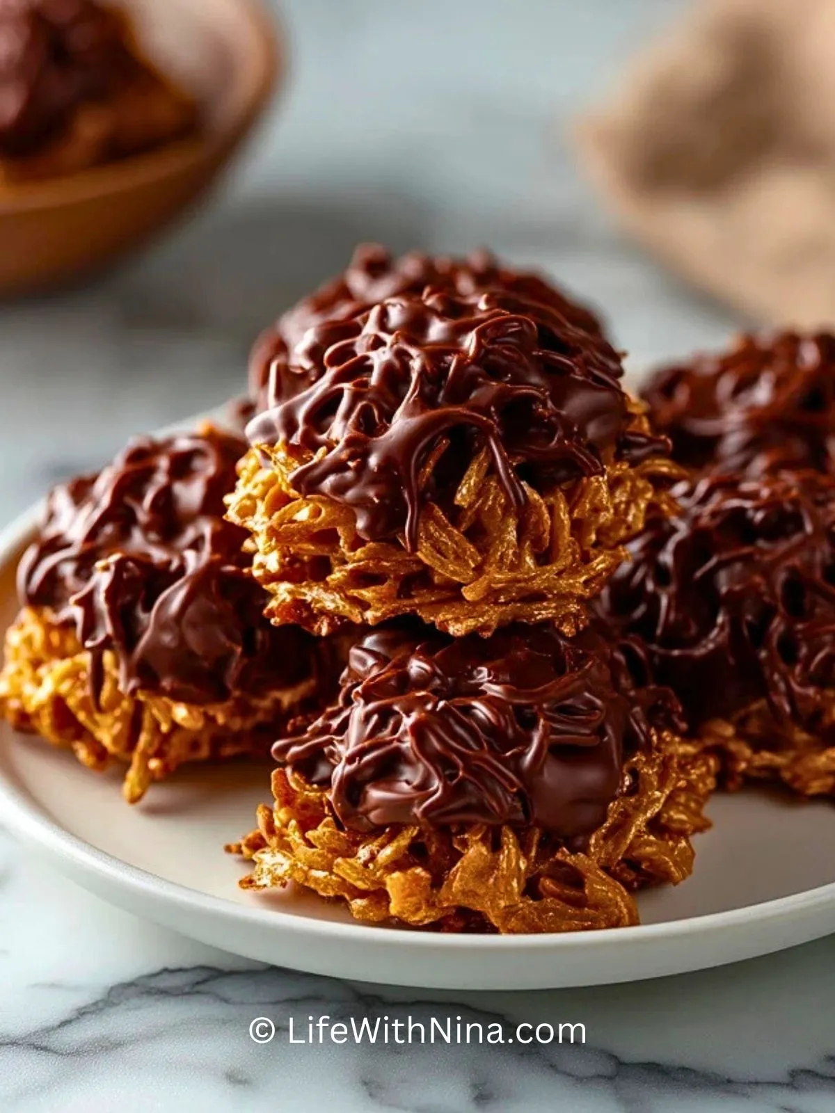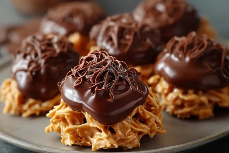 Am besten schmecken Schokoladen-Erdnussbutter-Haufen leicht gekühlt oder bei kühler Zimmertemperatur. So bleibt die Schokoladenschicht angenehm fest, während die Basis ihren knackigen Biss behält. Zum Servieren passen sie wunderbar zu Kaffee, schwarzem Tee oder einem Glas kalter Milch.