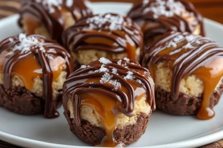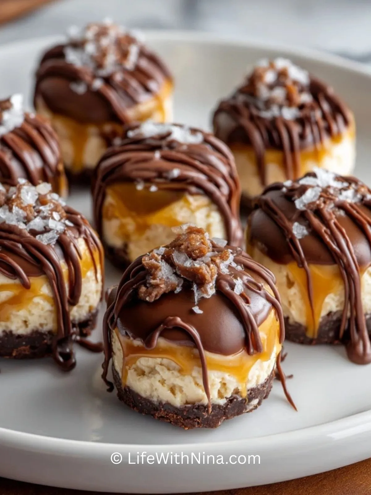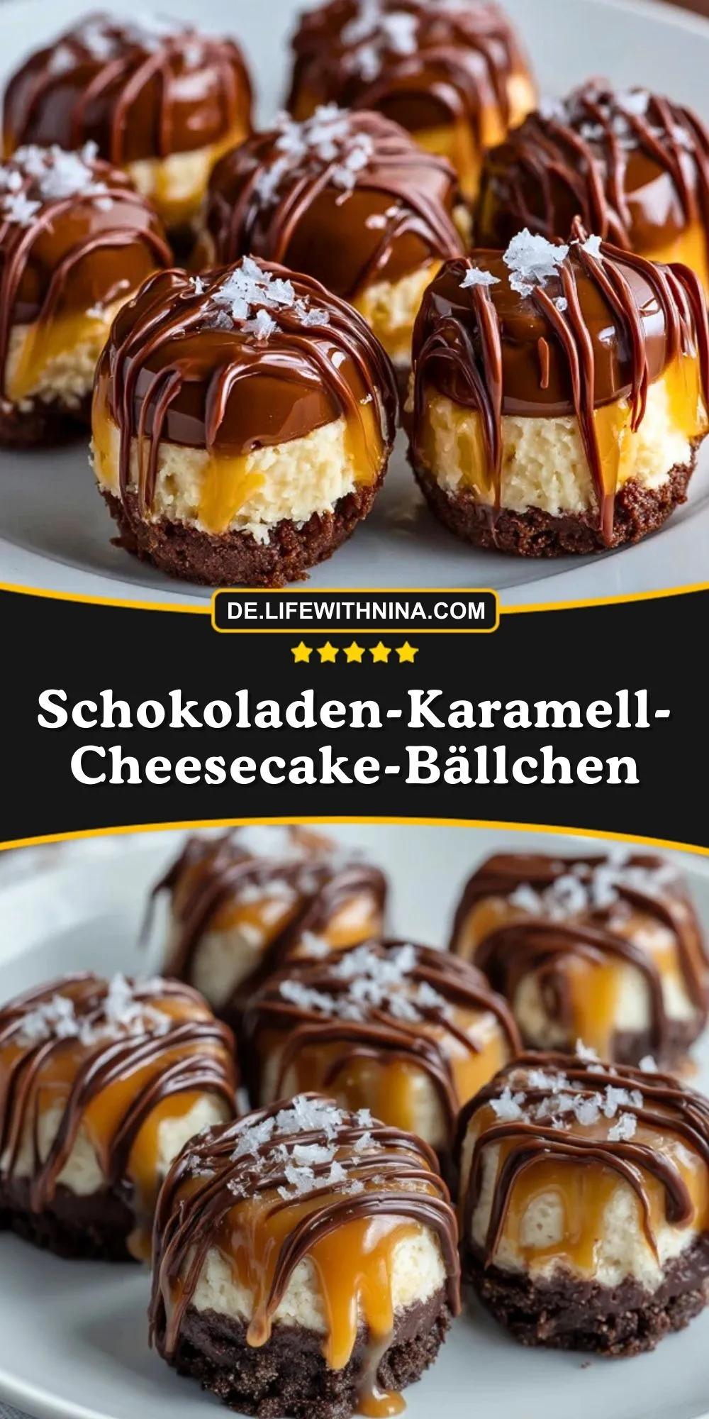 Diese Schokoladen-Karamell-Cheesecake-Bällchen vereinen einen saftigen Brownie-Boden, eine cremige Frischkäsefüllung und einen Kern aus zartem Karamell. Mit Schokoladenglasur und Meersalz garniert, sind sie das perfekte Dessert für besondere Anlässe oder als süßer Snack zwischendurch.