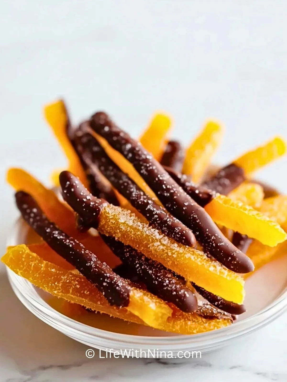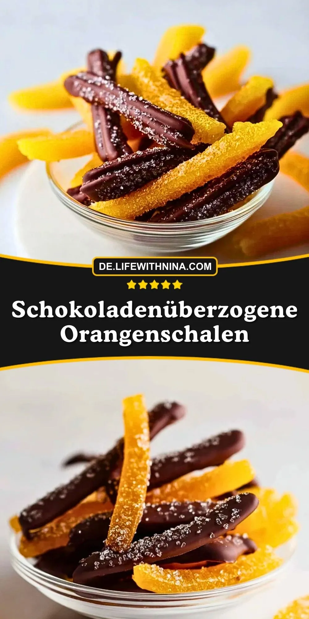 Und lass mich in den Kommentaren wissen, wie deine Version geworden ist. Hast du die Orangenschalen nur halb in Schokolade getaucht oder komplett überzogen? Hast du zusätzlich etwas Meersalz, Goldpuder oder fein gehackte Pistazien ausprobiert?