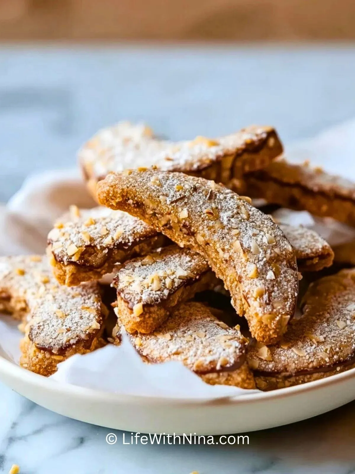 Diese schokolierten Mandelsplitter-Kipferl sind die perfekte Mischung aus zartem Mürbeteig, aromatischen Mandeln und einer unwiderstehlichen Schokoladenschicht. Sie schmecken herrlich nussig, knusprig und sind dank Puderzucker ein festlicher Genuss auf jedem Plätzchenteller. Die Kombination aus feinen Mandeln, Vanille und edler Zartbitterschokolade macht die Kipferl zu einem echten Highlight in der Weihnachtsbäckerei – aber eigentlich schmecken sie das ganze Jahr über.
