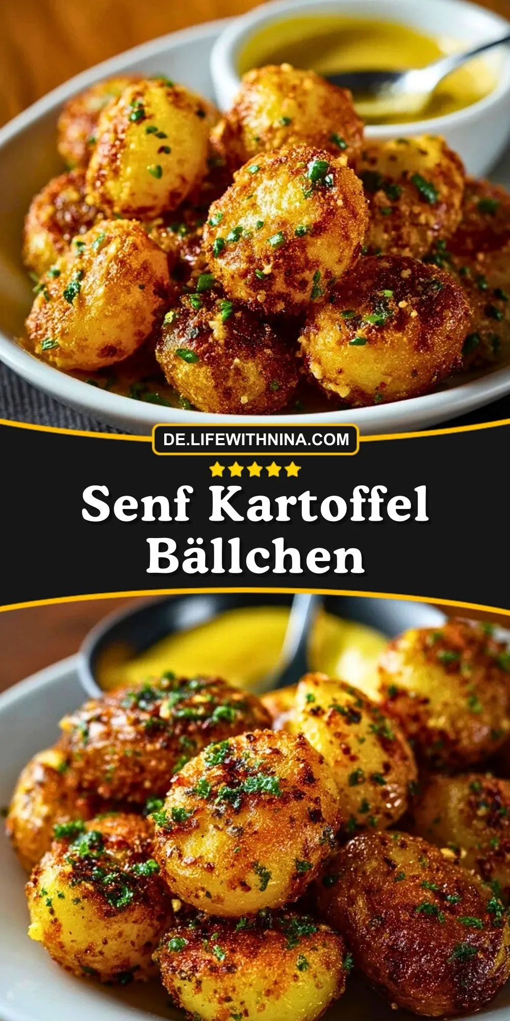 Diese Senf-Kartoffel-Bällchen sind außen herrlich knusprig und innen weich und aromatisch. Die Kombination aus Kartoffeln, mittelscharfem Senf, Parmesan und Kräutern macht sie zu einer würzigen Beilage, die auch als Snack oder Partyfingerfood wunderbar funktioniert.