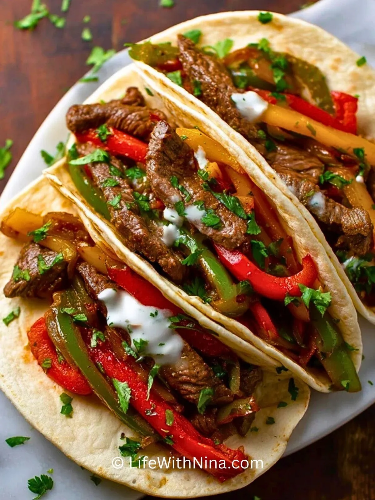 Steak Fajitas schmecken am besten direkt nach der Zubereitung, wenn das Fleisch saftig und das Gemüse noch leicht bissfest ist. Serviere dazu Limettenspalten, zusätzliche saure Sahne, Guacamole oder eine frische Salsa, damit jeder seine Portion nach eigenem Geschmack verfeinern kann.