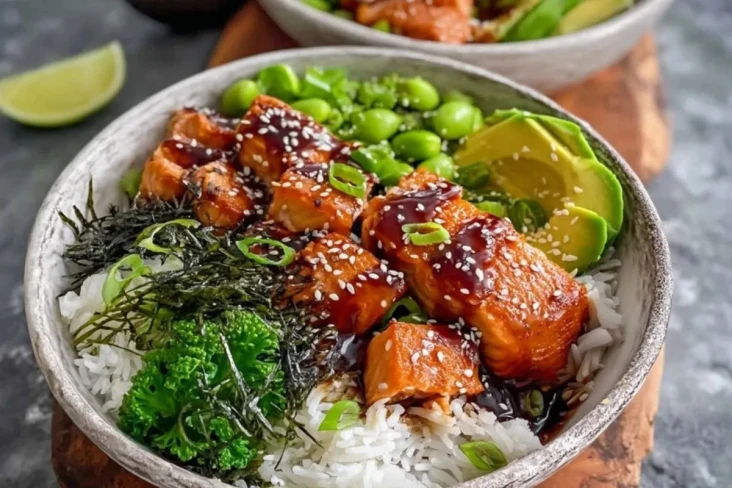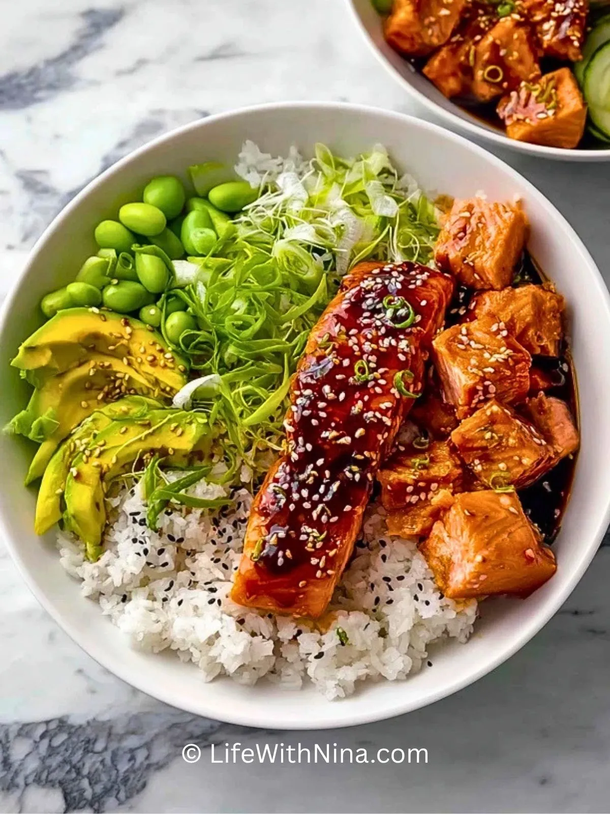 Der besondere Reiz dieses Gerichts liegt im Kontrast der Texturen und Aromen. Saftiger Lachs bringt Fülle und feinen Geschmack mit, der Reis sorgt für eine milde Basis, während Edamame, Brokkoli und Frühlingszwiebeln Frische und Biss liefern. Avocado bringt Cremigkeit in die Bowl, und die Teriyaki-Sauce verbindet alles mit einer ausgewogenen Kombination aus süß, salzig und leicht herzhaft. Genau diese Mischung macht Teriyaki-Lachs-Schalen so beliebt und vielseitig.