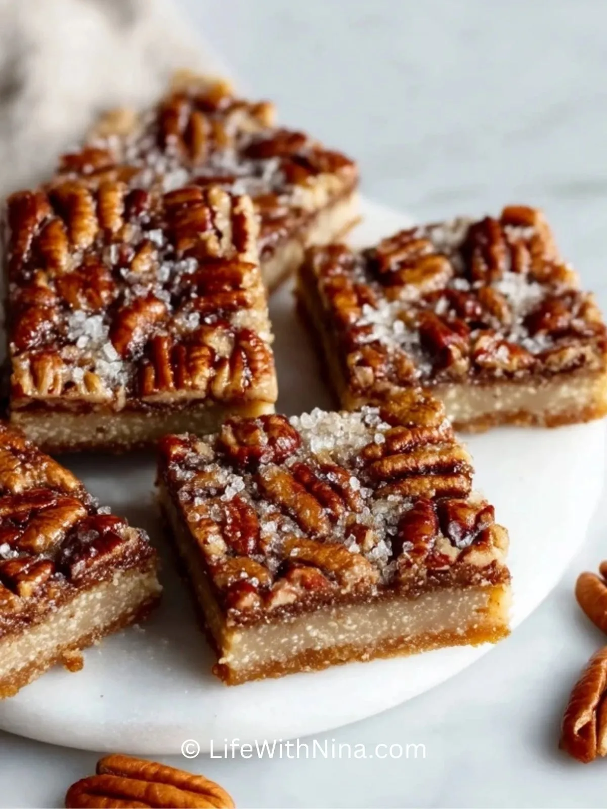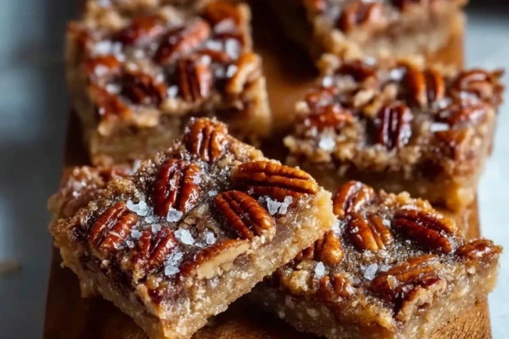 Die Form erneut in den Ofen geben und die Pekanusskuchenstücke weitere 25–30 Minuten backen, bis die Oberfläche goldbraun und fest ist. Nach dem Backen abkühlen lassen, mit etwas grobem Meersalz bestreuen und in Stücke schneiden. Am besten vollständig auskühlen lassen, bevor du sie servierst.