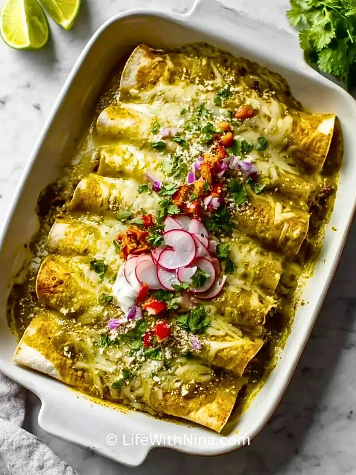 Diese unwiderstehlichen Rindfleisch-Enchiladas mit grüner Sauce sind genau das Richtige, wenn du ein herzhaftes Ofengericht suchst, das satt macht und dabei voller Aroma steckt. Zart gewürztes Hackfleisch, weiche Tortillas, geschmolzener Käse und eine pikante grüne Sauce verbinden sich zu einem Essen, das nach Familienküche, Gemütlichkeit und einem Hauch mexikanisch inspirierter Würze schmeckt.