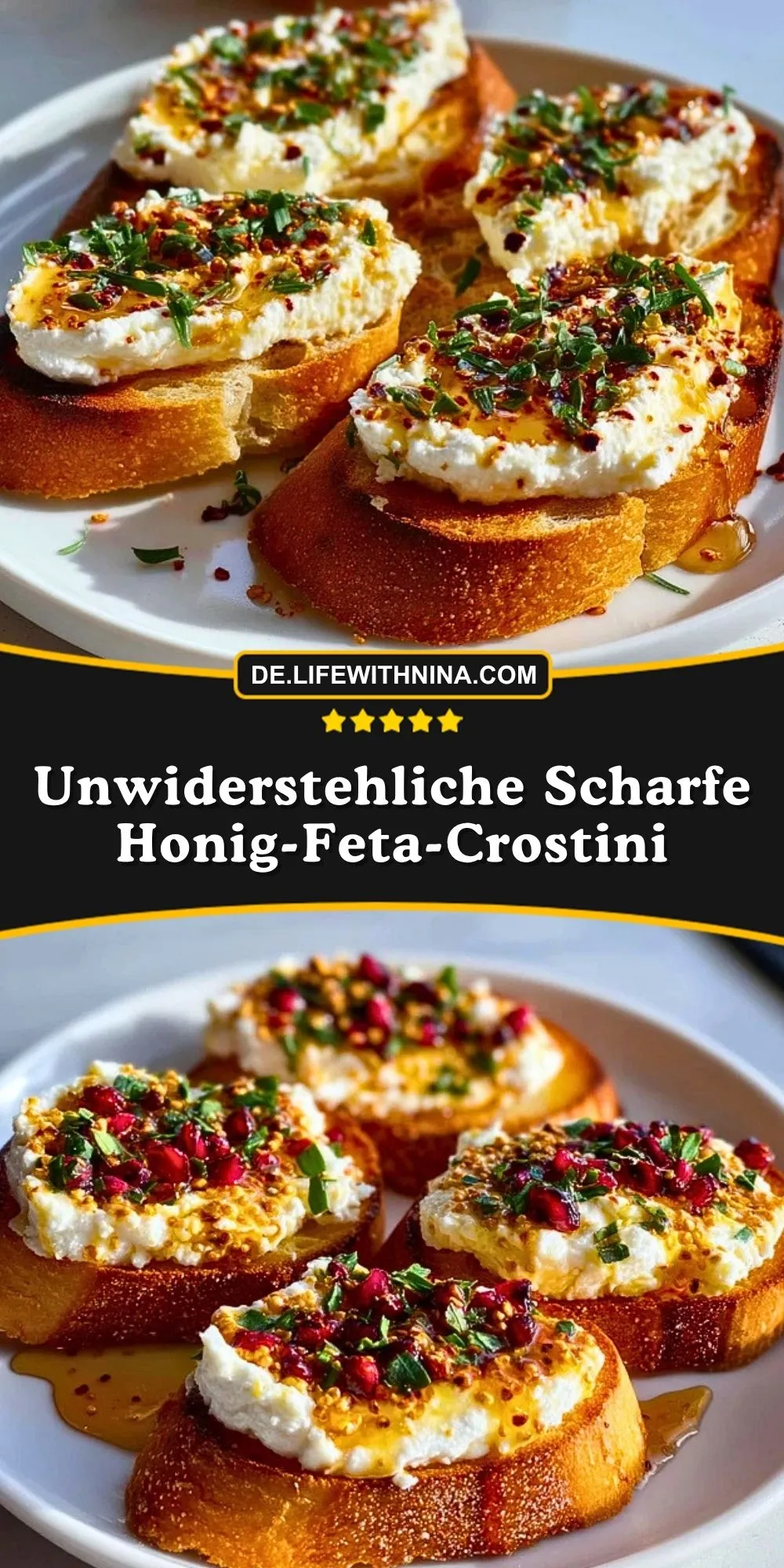 Besonders schön ist, dass diese Crostini gleichzeitig rustikal und elegant wirken. Das Brot wird außen kross, der Feta herrlich cremig, und die Toppings aus Kräutern, Honig und Chili sorgen für Tiefe und Charakter. Ob für einen gemütlichen Abend, ein festliches Essen oder als schneller Appetizer: Diese Crostini bringen sofort Farbe und Geschmack auf den Tisch.