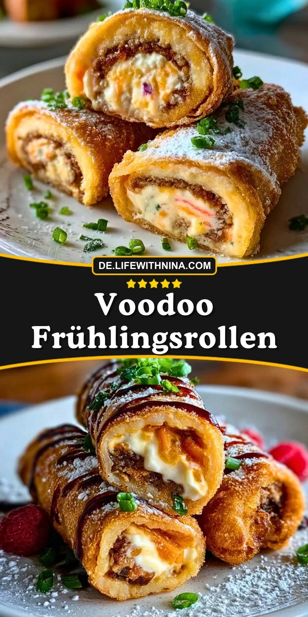 Die Voodoo Frühlingsrollen sind eine originelle Fusion aus asiatischer und westlicher Küche – knusprig gebacken, gefüllt mit einer Mischung aus würzig-süßen Zutaten und einem cremigen Topping. Ihr Aussehen erinnert an klassische Frühlingsrollen, doch die überraschende Füllung und die süße Dekoration machen sie zum Star jeder Party oder als Dessert für besondere Anlässe. Jede Rolle ist außen herrlich knusprig und innen wunderbar aromatisch, mit einem Hauch von Magie, der deinen Gaumen verzaubert.