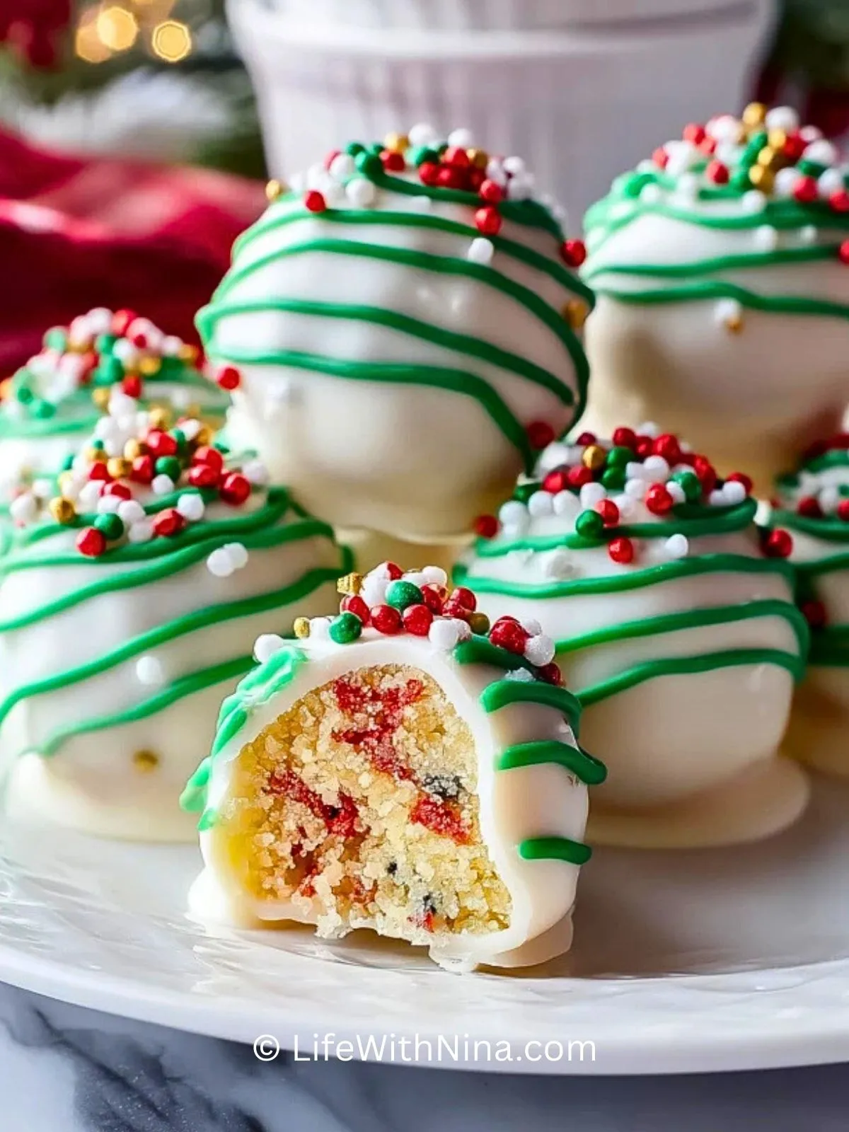 Die bunten Zuckerstreusel im Inneren erinnern an Konfetti im Schnee, während die grüne Deko-Schokolade und roten Perlen draußen für den typischen Weihnachts-Look sorgen. Perfekt für den Plätzchenteller, als essbares Mitbringsel oder als kleines Geschenk aus der Küche – diese Bällchen sind jedes Jahr ein Highlight.