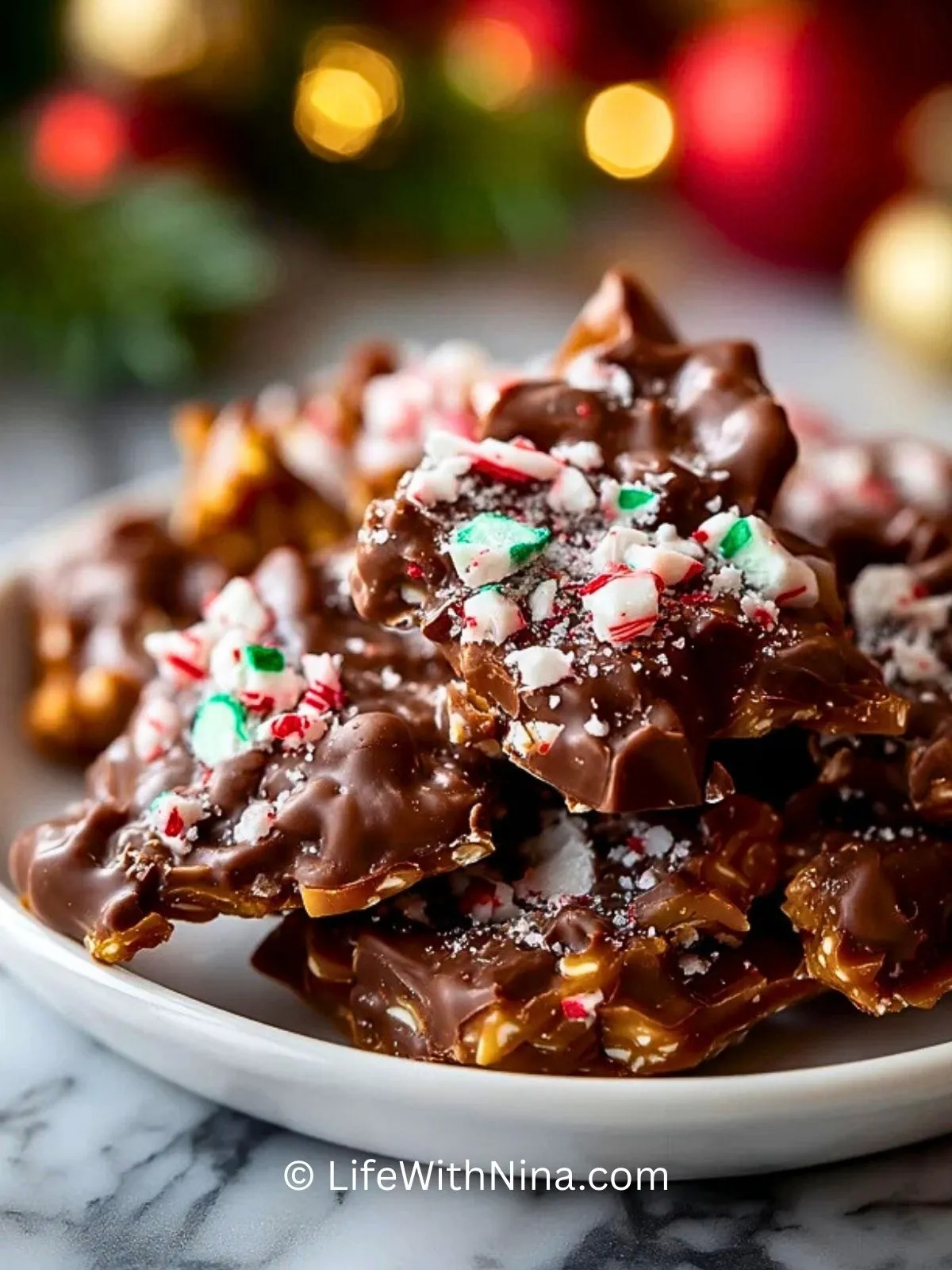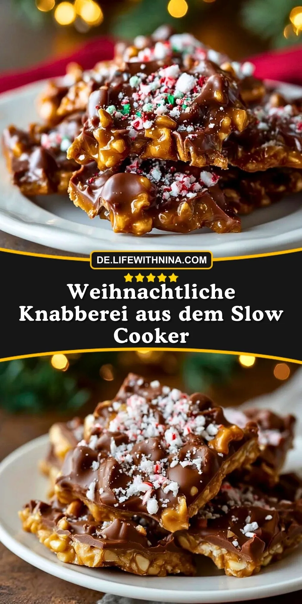 Diese weihnachtliche Knabberei aus dem Slow Cooker ist eine herrlich knackige Mischung aus Schokolade, Karamell, Salzbrezeln, Erdnüssen und Cornflakes, die im Schongarer langsam schmilzt und anschließend zu weihnachtlich dekorierten Schoko-Crunch-Stücken gebrochen wird – perfekt für Plätzchenteller, Geschenke aus der Küche oder den gemütlichen Filmabend.