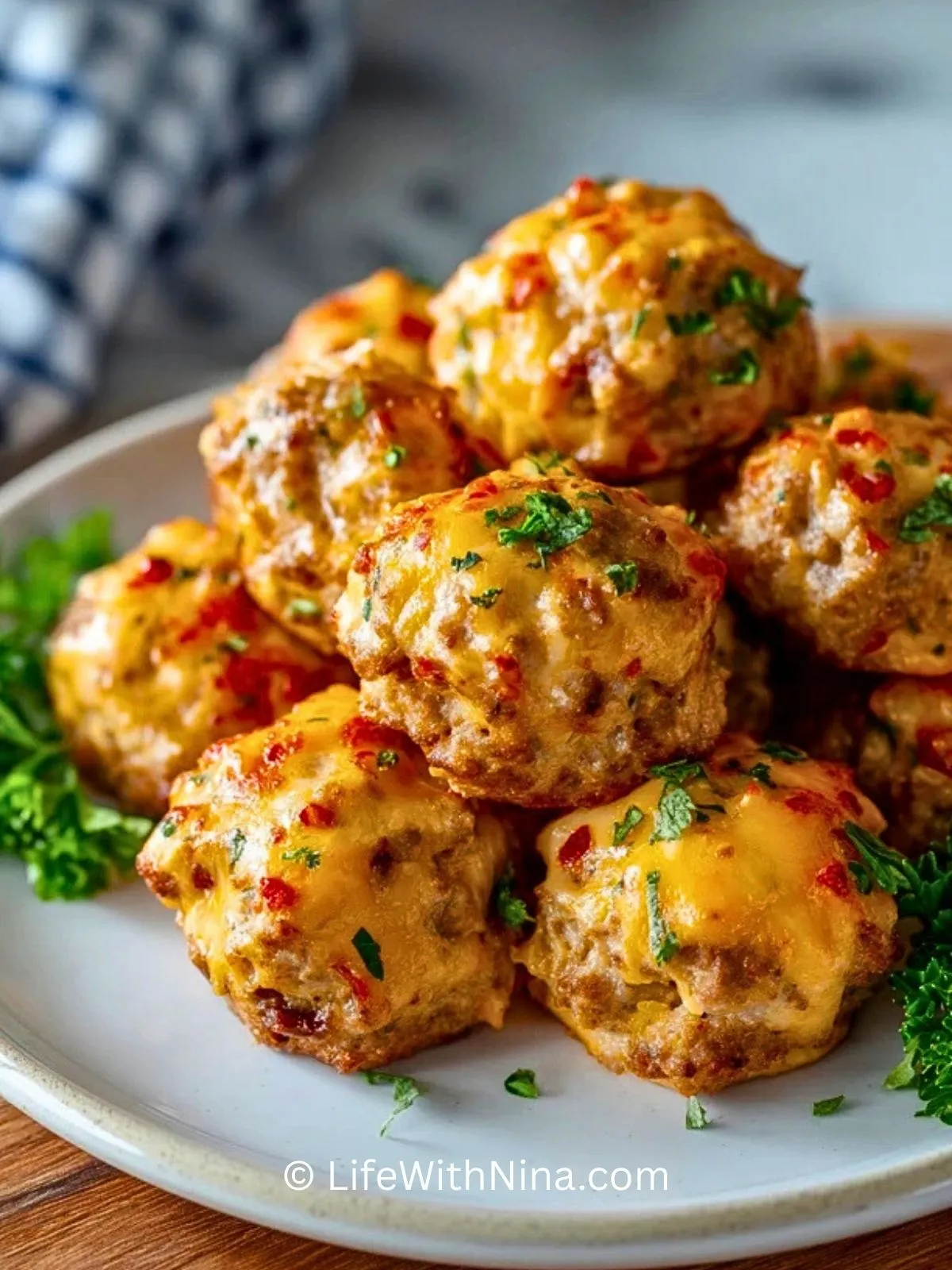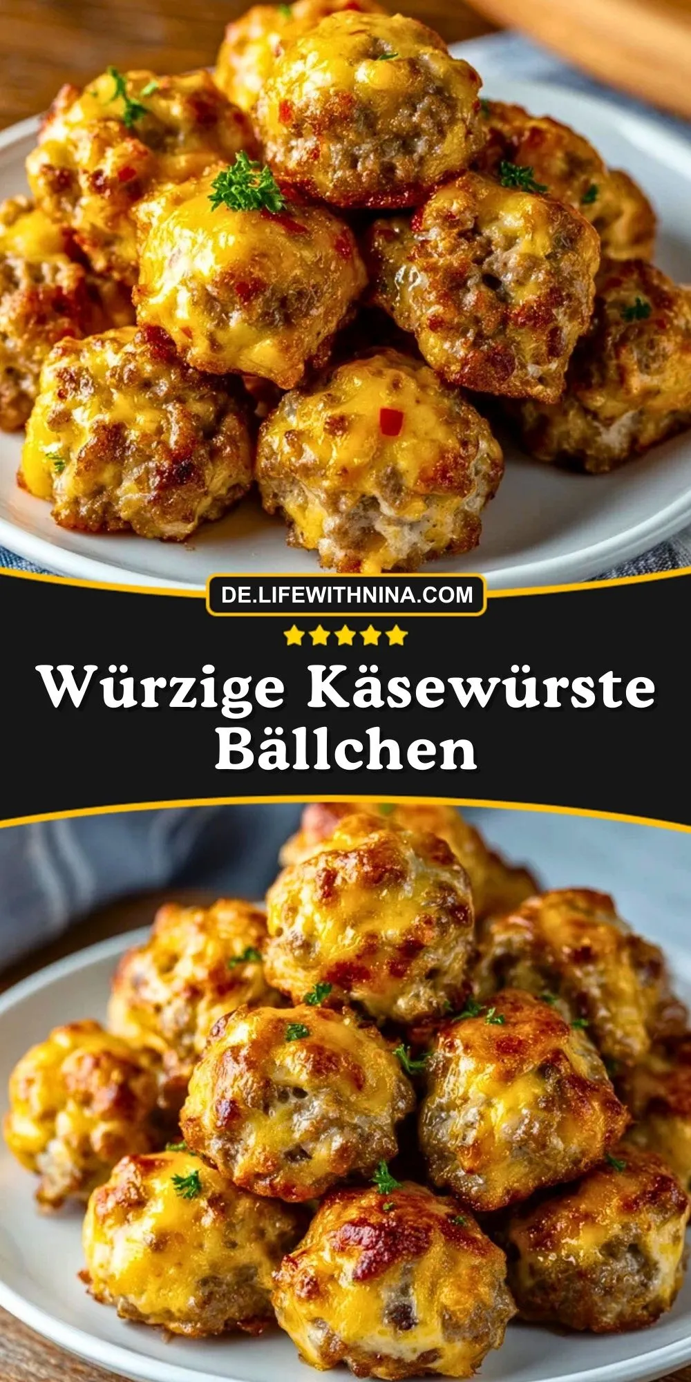 Würzige Käsewürste Bällchen sind kleine, im Ofen gebackene Wurstbällchen mit viel geschmolzenem Käse, die außen knusprig und innen saftig sind – perfekt als herzhafter Party-Snack, Fingerfood oder leckere Beilage mit Dip.